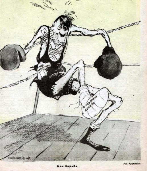 Карикатуры на Гитлера в советской прессе являлись неотъемлемой частью антифашистской пропаганды. В период Второй мировой войны, когда Германия была основным противником Советского Союза, карикатуры стали эффективным средством передачи политического послания и раскрытия характера нацистского режима. Они изображали Гитлера в комических ситуациях, подчеркивая его недостатки и безрассудство. Карикатуры не только развлекали публику, но и вызывали антигитлеровское настроение, способствуя укреплению боевого духа и единства населения в борьбе с фашизмом. Эти произведения искусства были одной из форм информационно-психологической войны, которая имела сильное воздействие на сознание людей и помогала поддерживать высокий моральный тон среди советских граждан.