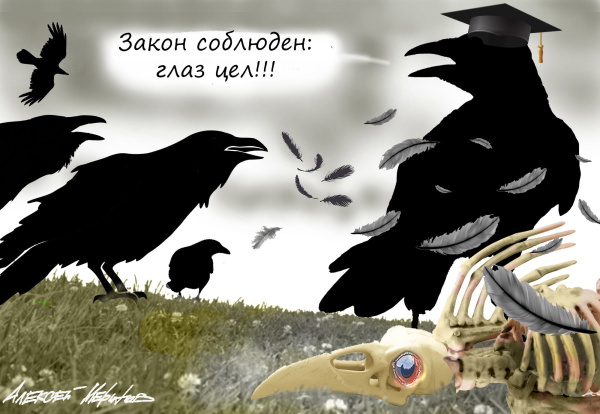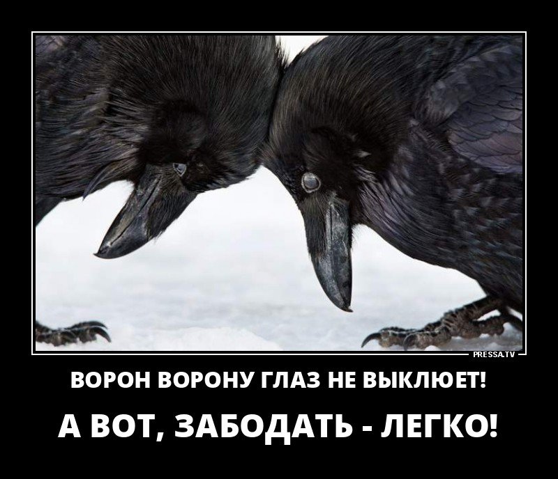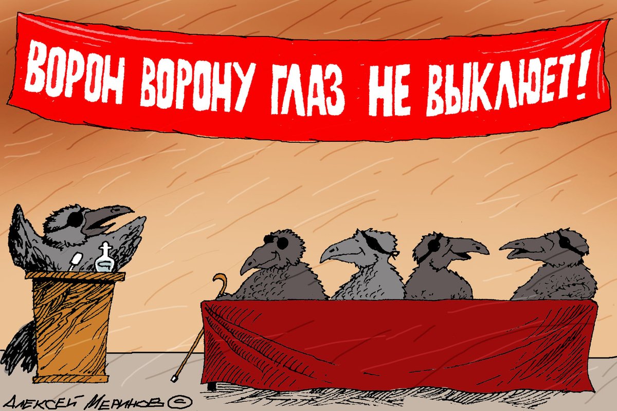 Карикатура "Ворон ворону глаз не выклюет" - яркий и остроумный изображенный эпизод, который отражает старую поговорку о том, что люди схожи между собой и часто не обращают внимания на недостатки других. Изображение двух ворон, рядом стоящих, одна из которых пытается выколоть глаз другой, символично демонстрирует, как в конкурентной среде мы часто стремимся причинить вред другим, чтобы достичь своих целей. Карикатура напоминает нам о важности сохранения более дружественного и взаимопонимающего отношения, а также о том, что самокритика и уважение к другим - ключевые качества, которые помогут нам гармонично сосуществовать в обществе.
