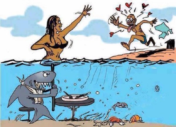 Русалка и мужик - это карикатура на необычное сочетание двух разных миров. Русалка, символизирующая загадочность, красоту и притягательность водных глубин, сталкивается с обычным мужиком, представителем сухопутного мира, простотой и непосредственностью. В этой карикатуре изображены контрасты и противоречия, которые привлекают внимание зрителя. Несмотря на свою нереальность, данная сцена придаёт забавности и юмора обыденной жизни, показывая, что даже самые несовместимые вещи иногда могут пересекаться и создавать интересные ситуации.