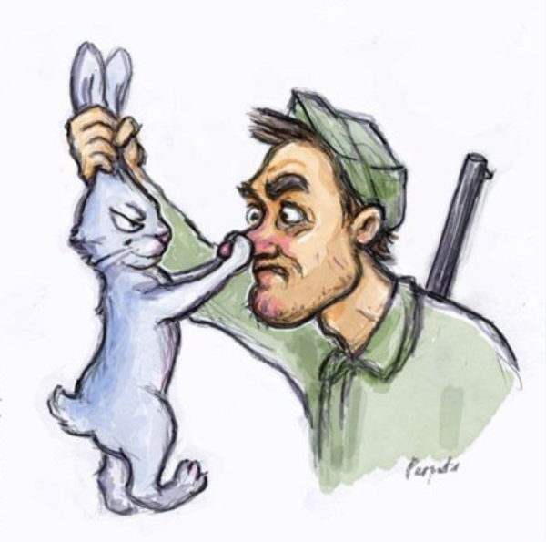 Карикатура "Охотник с зайцем" - это яркое и юмористическое изображение, которое игриво отражает взаимоотношения между охотником и его потенциальной добычей. На рисунке можно увидеть насмешливую ситуацию, где охотник, хотя и вооруженный ружьем, оказывается в затруднительном положении перед милым зайчиком. Карикатура вызывает улыбку и показывает, что иногда самые неожиданные и непредсказуемые обстоятельства могут перевернуть ситуацию с ног на голову. Весьма забавное и креативное произведение искусства, которое точно поднимет настроение любому зрителю.