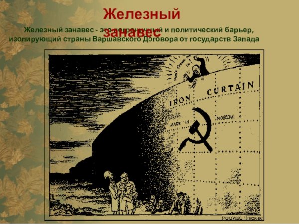 Железный занавес над Европой - это термин, который возник во времена холодной войны и описывает политическую и идеологическую разделенность континента на две части. Карикатуры являлись одним из способов выражения общественного мнения и сатиры на политические события того времени. Они часто изображали лидеров и символы СССР и Западных стран в комическом ключе, подчеркивая абсурдность и противоречия их политики. Карикатуры помогали людям осознать всю абсурдность и парадоксы этой эпохи, а также вызывали улыбку и задумывали о состоянии мира.