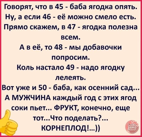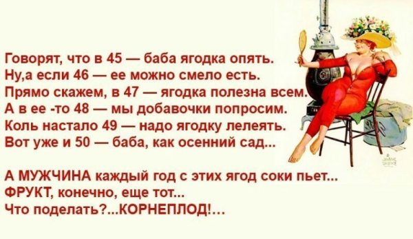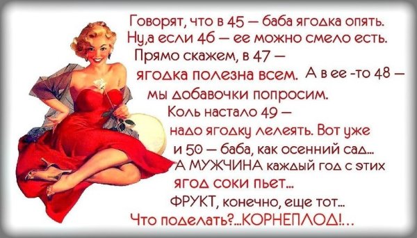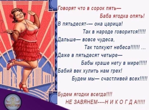 Карикатура "45 баба ягодка опять" - это художественное произведение, которое привлекает внимание своей оригинальностью и юмором. Она создана с учетом актуальной темы и непредсказуемого хода событий, что делает ее особенно интересной для зрителя. В ней изображены 45 жизнерадостных и эксцентричных баба-ягодок, которые вновь появляются на сцене, чтобы подарить нам долю смеха и радости. Через сочетание ярких цветов, выразительных лиц и эпатажных нарядов художник передает свою интерпретацию современной реальности, а также играет с общепринятыми стереотипами и представлениями об этой легендарной личности. Карикатура "45 баба ягодка опять" - это не только источник развлечения, но и возможность задуматься о мире вокруг нас и наших собственных взглядах на него.