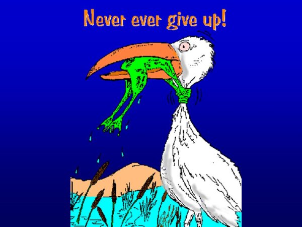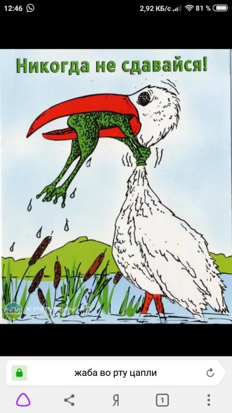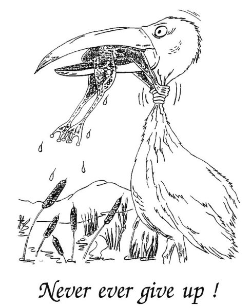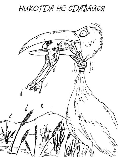 Карикатура "Никогда не сдавайся, лягушка-цапля" - это веселая и вдохновляющая рисунок, который передает мощное сообщение о неотступности и настойчивости. На нем изображена лягушка и цапля, которые представляют две разные животных. Лягушка символизирует нас, людей, которые сталкиваются с препятствиями и трудностями в жизни, но не сдаются и продолжают бороться за свои цели. Цапля, занимающая высокую позицию, может быть представлена как успех или достижение, к которому мы стремимся. Карикатура напоминает нам, что важно не опускать руки, даже если поначалу наши возможности кажутся ограниченными или мы сталкиваемся с трудностями. Ведь только упорный труд и уверенность помогут нам достичь поставленной цели.