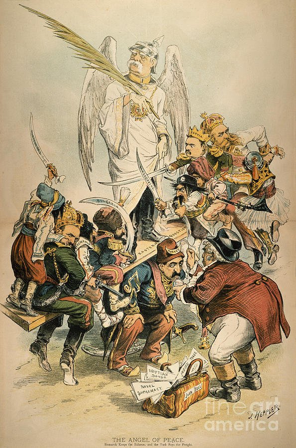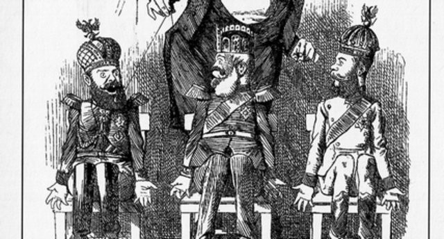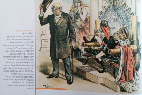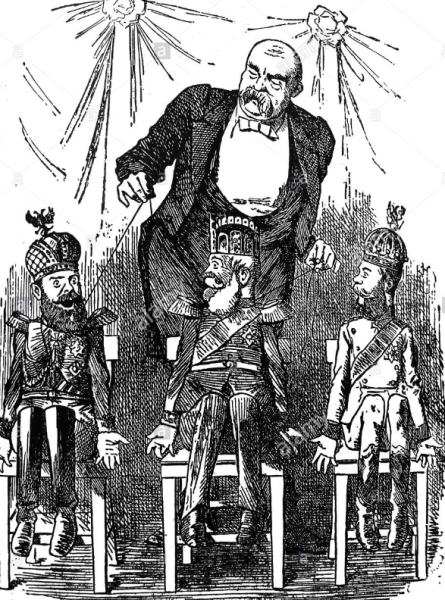 Карикатура "Бисмарк и три императора" является ярким примером художественного изображения, которое в юмористической форме передает сложные политические отношения конца XIX века. На рисунке изображены Отто фон Бисмарк, известный немецкий политик и канцлер Германской империи, а также трое самых молодых императоров того времени - Вильгельм I, Фридрих III и Вильгельм II. Карикатура не только показывает физическое сходство между этими личностями, но и играет на противоречиях и спорах, которые они переживали в своих политических отношениях. Этот художественный образ отражает историческую значимость этих лиц и призывает зрителя задуматься над драматичностью их взаимодействий на фоне европейской истории.