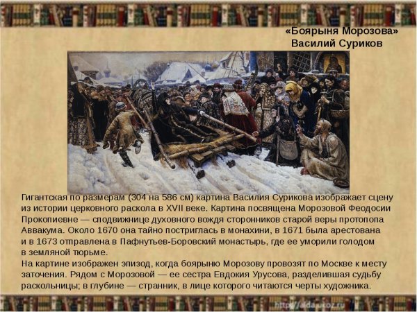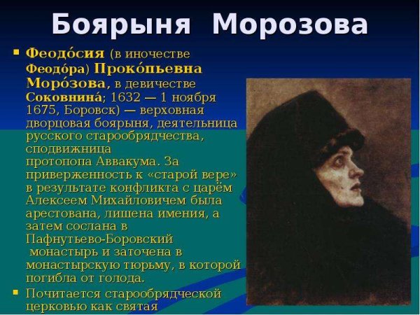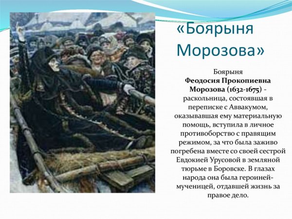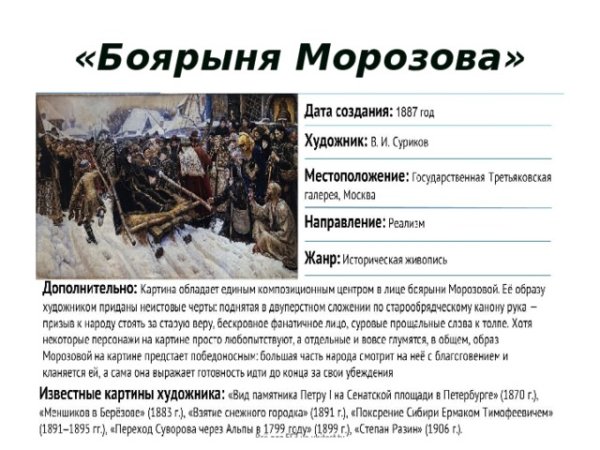 Боярыня Морозова, известная также как "Карикатура на бояр" - это знаменитая картина русского художника Ильи Репина, созданная в 1887 году. Картина олицетворяет одного из самых могущественных и богатых представителей русской знати - боярина. На полотне изображена Ивана Фёдоровича Морозова с его супругой Варварой Сергеевной, которая прозвана Боярыней Морозовой. Отличительной чертой этой картины является сильное выражение лиц главных героев, которые иллюстрируют их эгоистичность, жадность и безразличие к страданиям простого народа. "Боярыня Морозова" является ярким примером русского реализма и одной из самых значимых работ Ильи Репина.