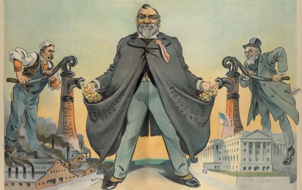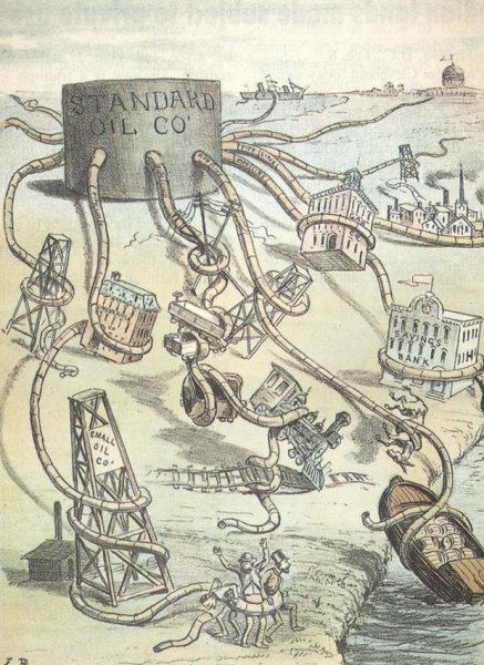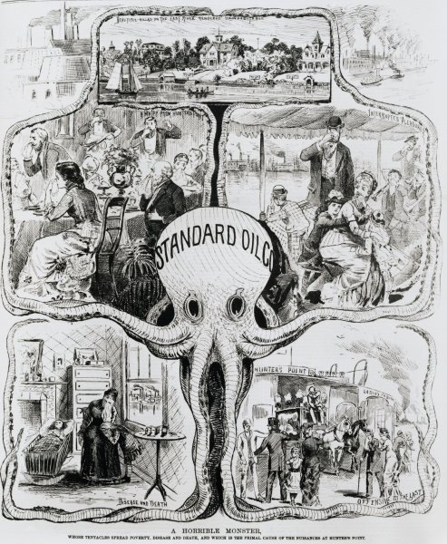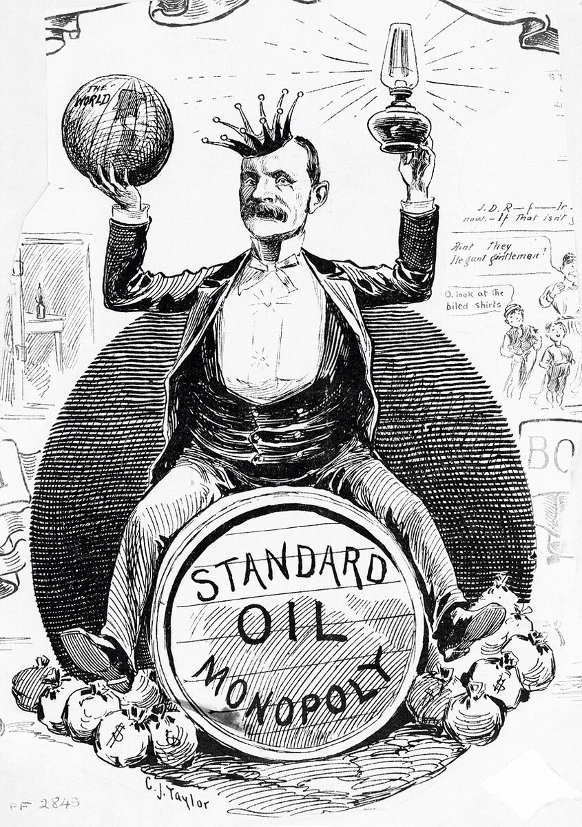 Одна из самых известных карикатур, посвященная легендарному бизнесмену и промышленнику Джону Рокфеллеру, представляет собой яркий и сатирический образ его власти и влияния. Рокфеллер, как один из основателей нефтяной империи Standard Oil, был не только одним из самых богатых людей своего времени, но и главным символом монополии и коррупции в американском бизнесе. Карикатура изображает его в виде жадного и беспощадного человека, держащего в руках земной шар и стремящегося контролировать все сферы экономики. Она передает смысл иронии и критики по отношению к безумной алчности и властолюбию Рокфеллера, показывая, что такая концентрация богатства и власти может иметь опасные последствия для общества.