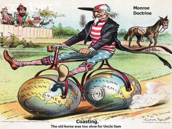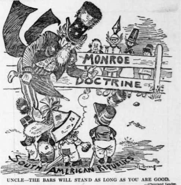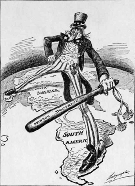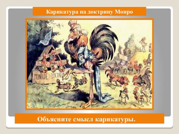 Доктрина Монро - это политическое и внешнеполитическое учение, которое было предложено президентом Джеймсом Монро в 1823 году. Она призывала к неприятию иностранных вмешательств в дела Латинской Америки и заявляла о том, что Соединенные Штаты будут защищать свои интересы на западном полушарии. Доктрина Монро имела значительное влияние на развитие отношений между США и странами Латинской Америки, а также оказала влияние на формирование принципов международного права. Эта политика часто становилась объектом карикатур и сатиры, которые иллюстрировали ее противоречивость и сложность применения в реальной политике.