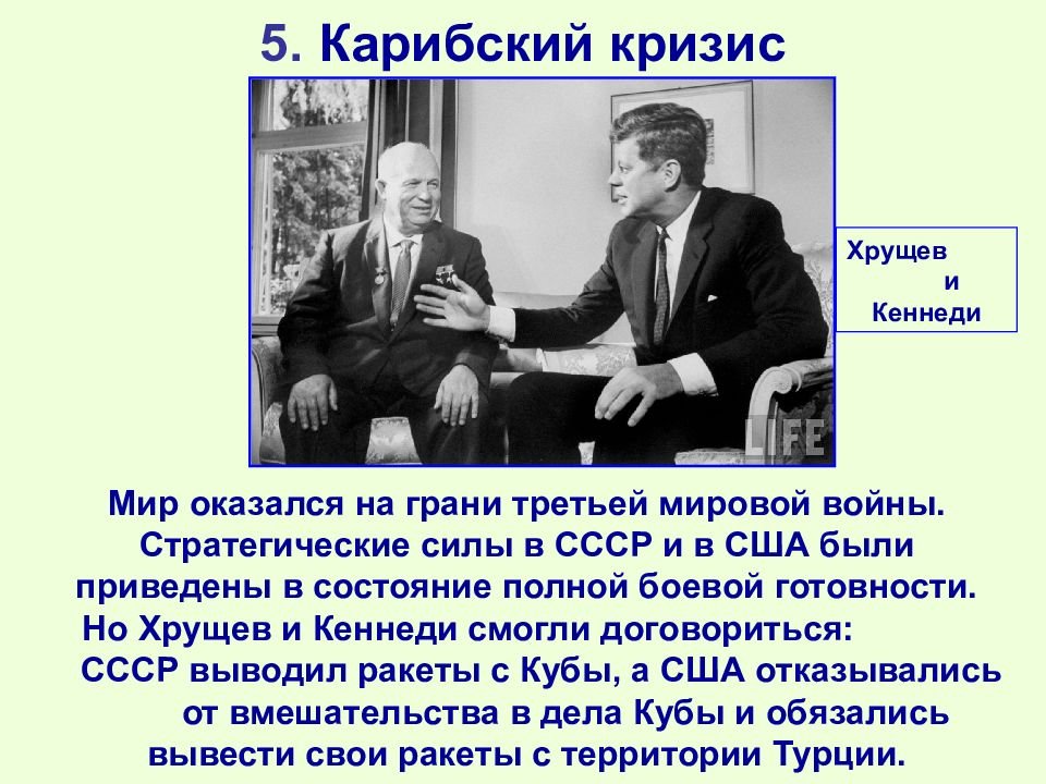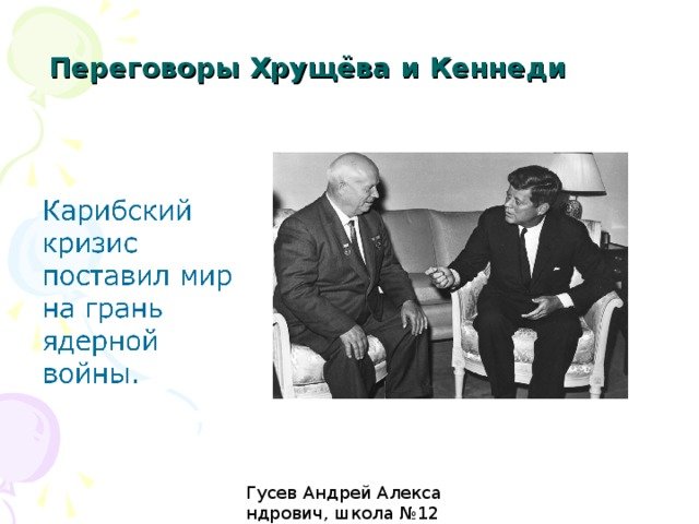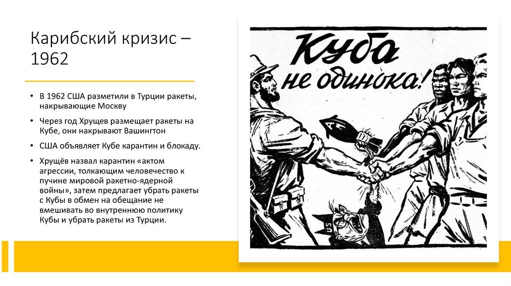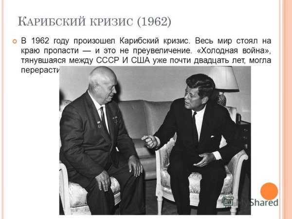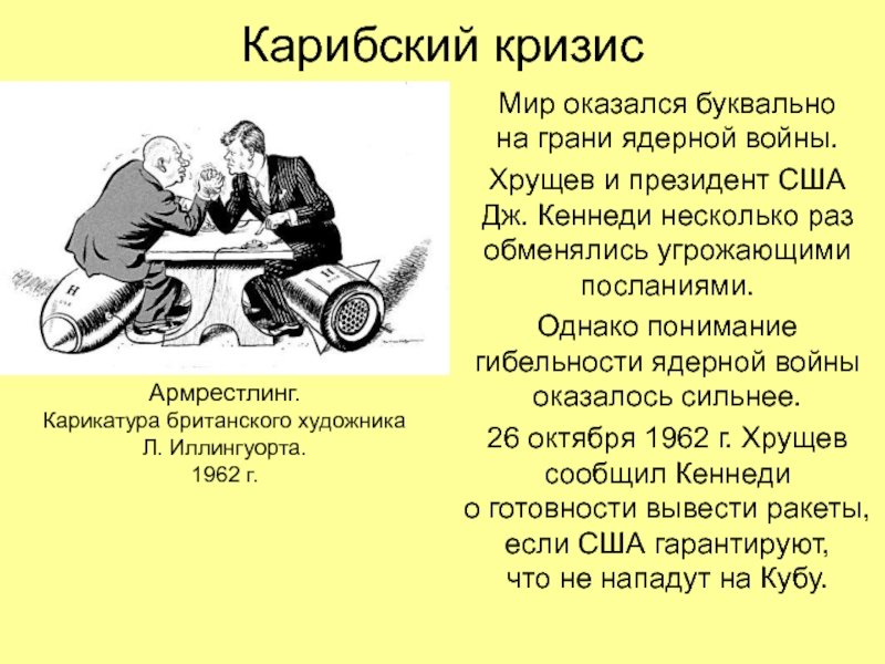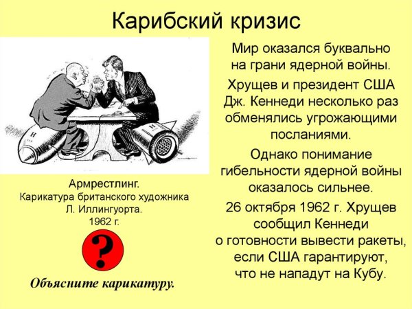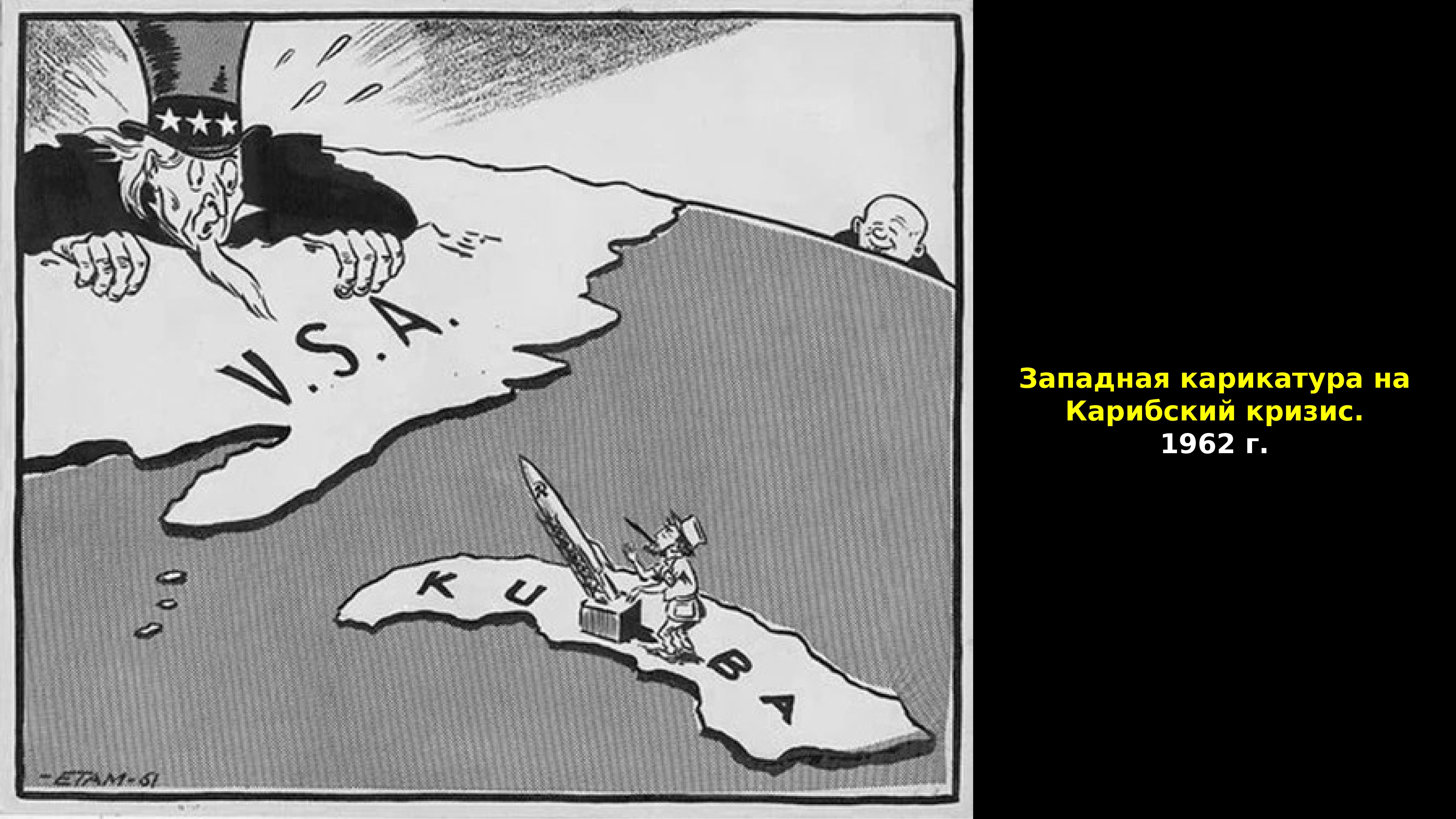 Карибский кризис, произошедший в 1962 году, стал одним из самых напряженных и опасных моментов в холодной войне между СССР и США. Лидеры двух держав - Никита Хрущев и Джон Кеннеди - вступили в противостояние, которое почти привело к ядерной войне. Карикатуры, посвященные этому событию, часто иронизировали над поведением обоих лидеров и их решениями. Они отображали их в различных смешных и нелестных ситуациях, показывая как выглядел этот конфликт с юмористической стороны. Карикатуры помогли людям осознать серьезность ситуации и отразить свою тревогу и беспокойство в отношении возможного ядерного конфликта.
