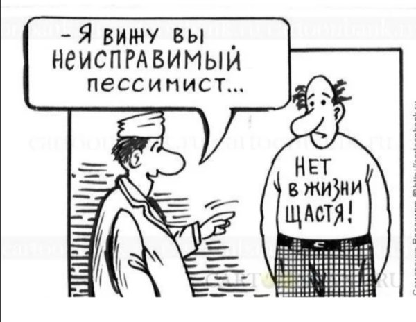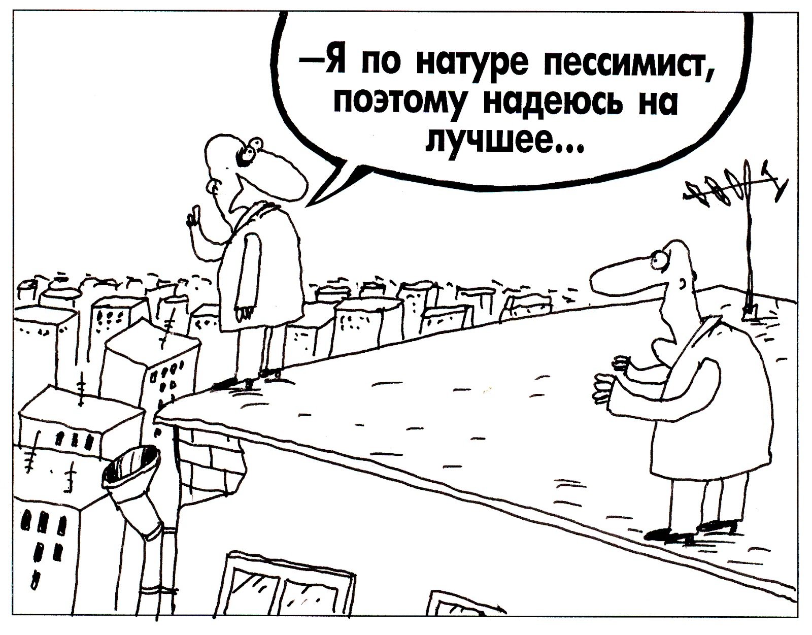 Пессимист - это карикатурный образ, который олицетворяет человека, склонного видеть только негативные аспекты жизни и событий вокруг себя. Это человек, который всегда готов увидеть черную половину стакана и не замечает позитивных моментов. С помощью разнообразных штампов и стереотипов, пессимист карикатура подчеркивает свою отрицательную точку зрения на мир, разделяя его на "черное" и "белое". В своих высказываниях и поступках пессимист создает комическую ситуацию, позволяющую наблюдателям улыбнуться и задуматься о том, как важно сохранять оптимистическое отношение к жизни.