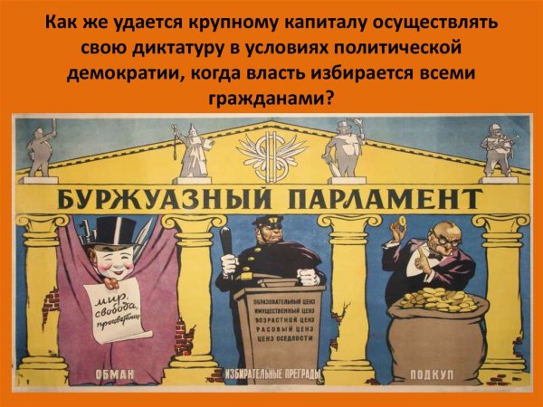 Буржуазный парламент - это образ, символизирующий карикатурное изображение политической системы, которая основана на интересах буржуазии, или представителей среднего и высшего классов общества. В таком парламенте принимаются решения, которые в большей степени отражают желания и потребности этих классов, игнорируя интересы более низших социальных слоев. Карикатурный подход позволяет подчеркнуть негативные аспекты такой системы, например, коррупцию, несправедливость, непрозрачность принятия решений и т.д. Буржуазный парламент - это метафора, используемая для критики политической системы, где власть в большей степени закрепляется за определенными экономическими и социальными группами.