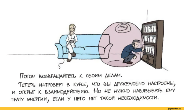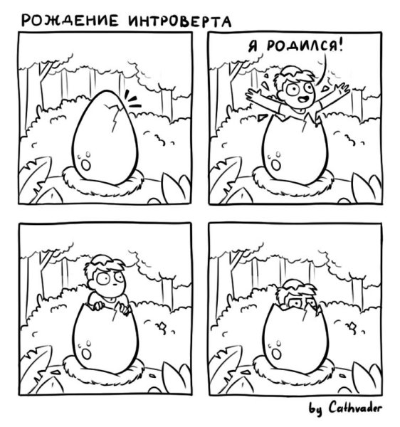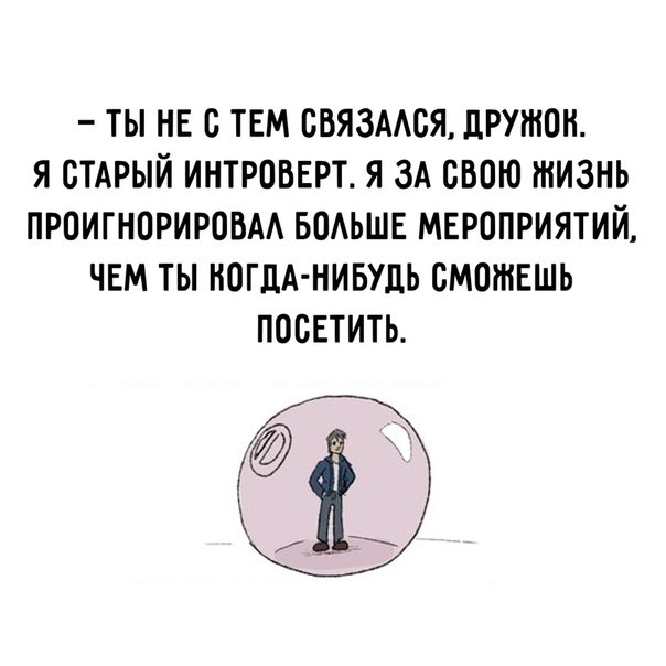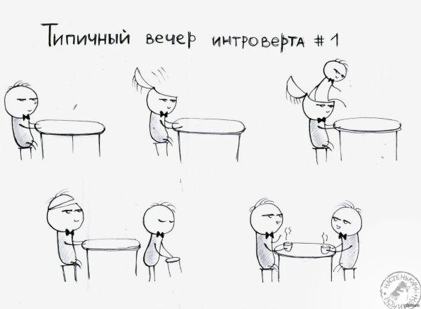Интроверт - это человек, который предпочитает уединение и тишину перед общественными мероприятиями и большими группами людей. Он находит свою энергию внутри себя, проводя время в одиночестве или с небольшой близкой компанией друзей. Интроверты обладают особенной глубиной мысли и часто проявляют креативность и интеллектуальные способности. Они любят анализировать и размышлять, их внутренний мир является источником вдохновения и саморазвития. Карикатура на интроверта может подчеркнуть его наблюдательный характер и скрытую смешную сторону личности.