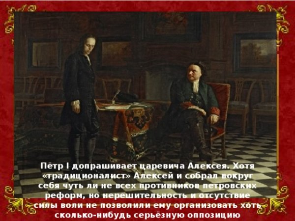 На картине изображен момент допроса царевича Алексея Петром. Взгляды обоих персонажей наполнены напряжением и неразрешенными вопросами. Петр, сидящий за столом, выглядит серьезным и решительным, готовым раскрыть правду. Алексей, напротив, выглядит напряженным и неуверенным, его глаза полны тревоги и стресса. Картину отличает яркость и контрастность цветов, подчеркивающая эмоциональную напряженность этого момента. Весь сюжет находится во власти сильных эмоций, вызывая у зрителя интерес и желание узнать, что происходит в этой важной сцене и как развивается сюжет дальше.