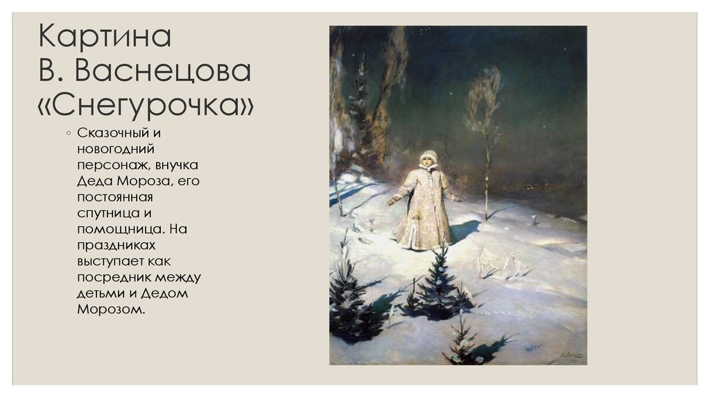 Картина "Снегурочка" является одним из самых известных произведений русского художника Виктора Михайловича Васнецова. На этой картине художник изобразил красивую и загадочную героиню русских народных сказок - Снегурочку. У нее светлая и нежная внешность, она одета в белое платье с меховым обрамлением и украшена снежной короной. Картина передает атмосферу зимнего волшебства и загадочности, а лицо Снегурочки наполнено невинностью и чистотой. Это произведение искусства является символом русской культуры и народных традиций, а также является прекрасным примером русского исторического и жанрового живописи.