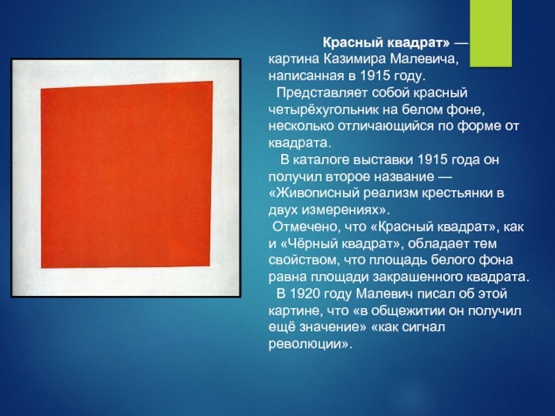 "Красный квадрат" - это знаменитая абстрактная картина, созданная известным русским художником Казимиром Малевичем. Это произведение искусства является иконой супрематизма, художественного направления, основанного на использовании геометрических форм и чистых цветов. "Красный квадрат" был выполнен в 1915 году и стал одной из самых провокационных работ своего времени. Картина представляет собой простой квадрат красного цвета, расположенный на белом фоне. Это произведение вызывает множество разнообразных толкований и интерпретаций, отражая идею о бесконечных возможностях и влиянии искусства на сознание зрителя. "Красный квадрат" стал символом модернизма и воплощением новаторских идей Малевича.