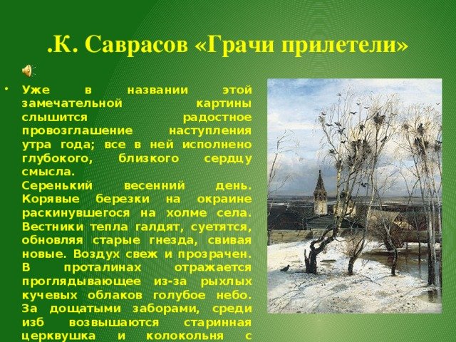 Саврасов Грачи прилетели описание