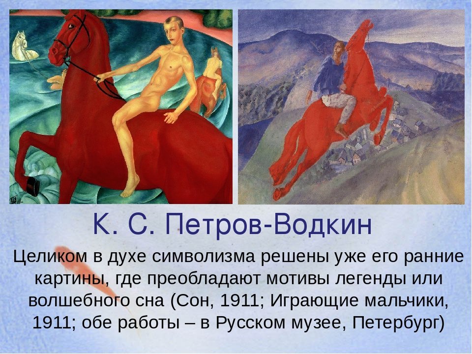 Картины Петрова Водкина - это уникальные произведения искусства, созданные выдающимся русским художником Владимиром Егоровичем Петровым-Водкиным. В его работах прослеживается сильное влияние футуризма и символизма, что делает каждую картину наполненной глубоким смыслом и эмоцией. Яркие цвета, динамичные формы и нетрадиционные композиции являются характерными чертами его стиля. Картины Петрова Водкина известны своей художественной оригинальностью и способностью передать настроение истории, которую они рассказывают. Они позволяют зрителю окунуться в мир визуальных образов и пережить неповторимые эмоции. Безусловно, работы Петрова Водкина являются настоящими произведениями искусства и достойны признания и уважения.