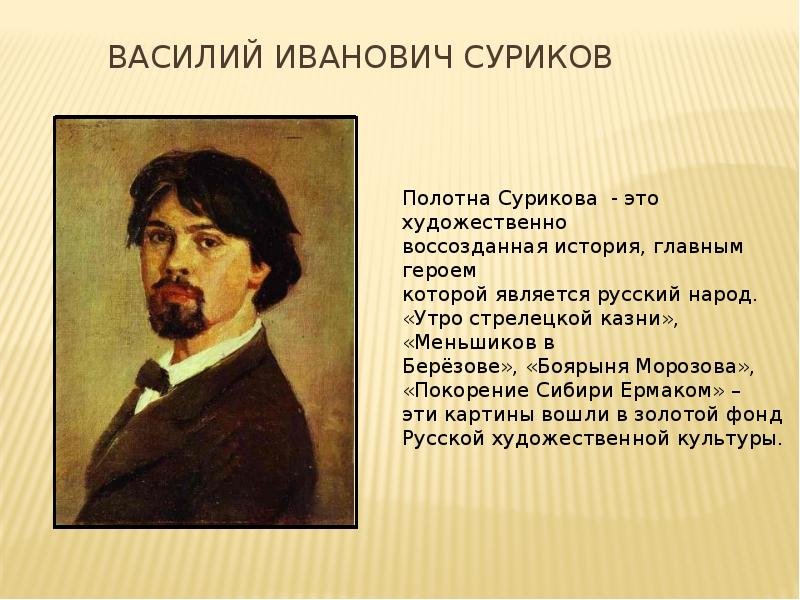 Василий Суриков - знаменитый русский художник-историк, чьи картины стали настоящими шедеврами искусства. Его произведения отличаются высоким мастерством исполнения, неповторимым стилем и глубоким содержанием. Суриков умел передать на холсте эпические сцены из истории России, показать жизнь и быт простого народа. В его работах можно увидеть прекрасное владение цветом, светотени и композицией. Каждая картина Сурикова - это уникальный повествующий о прошлом мире, который заставляет зрителя задуматься, поражает своей красотой и создает особую атмосферу. Благодаря своему таланту и работе Суриков стал одним из самых значимых и признанных художников в истории русского искусства.