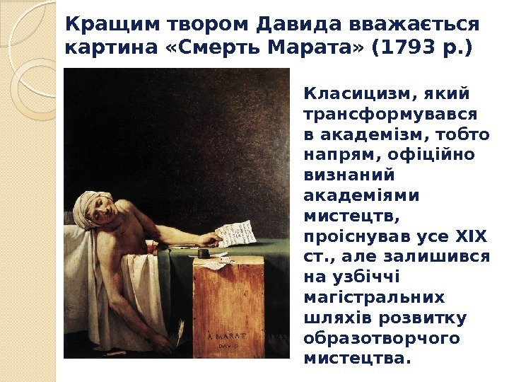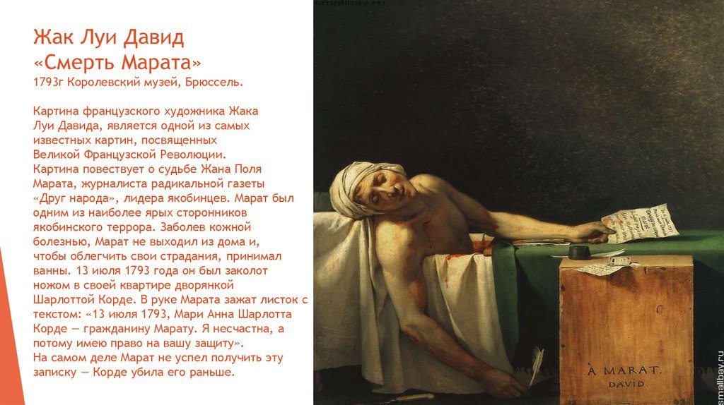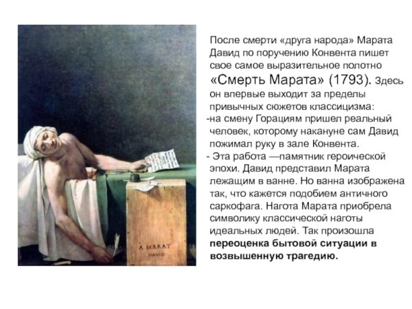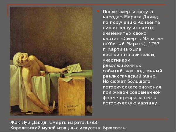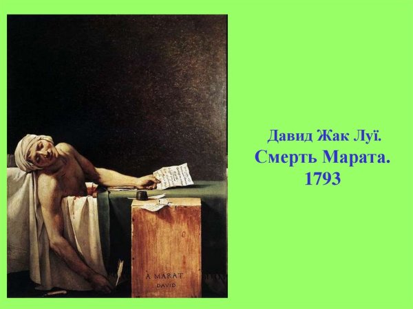 «Смерть Марата» – знаменитая картина, написанная французским художником Жаком-Луи Давидом в 1793 году. Это произведение искусства стало одним из символов Французской Революции и является одним из наиболее известных портретов в истории живописи. На картине изображен Жан-Поль Марат, лидер революционного движения, который был убит шариком из пистолета. Картина передает сильные эмоции и вызывает душевные трепеты у зрителей, показывая страдания и мученичество Марата. Детали картины, такие как темная цветовая гамма и драматичное освещение, создают атмосферу напряжения и трагедии. Одним словом, «Смерть Марата» - это произведение искусства, которое не только отражает исторический период, но и воплощает глубокие чувства и эмоции.