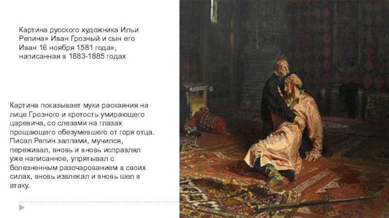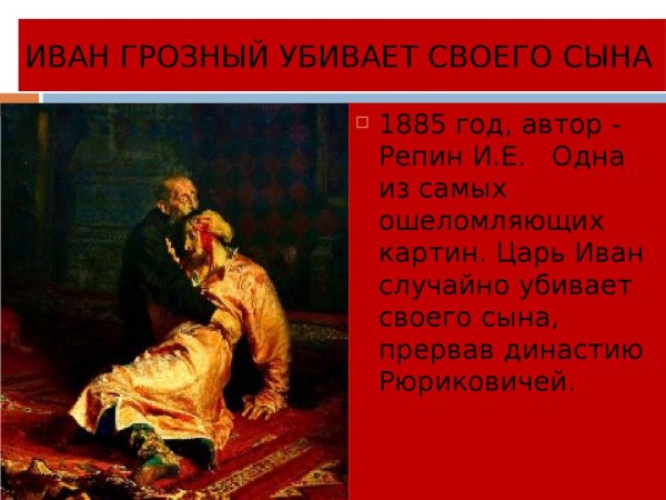 Одной из самых известных и запоминающихся картин в истории русского искусства является "Иван Грозный убивает". Созданная талантливым художником, она воплощает силу и эмоциональность этого мрачного исторического периода. Величественные кисти передают неподдельную ярость и ужас правителя, позволяя зрителю проникнуться атмосферой времени и почувствовать всю напряженность и драматизм событий. Композиция произведения искусно выстроена, каждая деталь имеет свое значение и сообщает определенную информацию о характере и настроении главного героя. Одним взглядом на "Ивана Грозного убивает" можно погрузиться в историю России и почувствовать весь размах и сложность времени, которое отображено на полотне. Эта картина оставляет незабываемое впечатление и заставляет задуматься о том, что может происходить в душе человека, обладающего такой властью.
