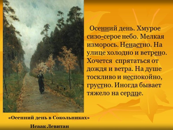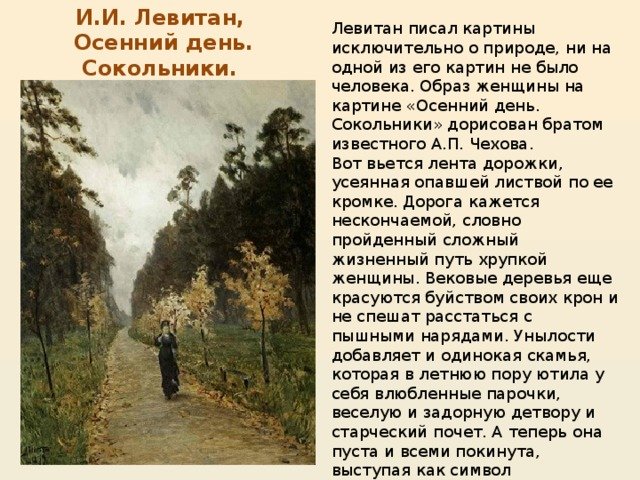 "Осенний день в Сокольниках" - это одна из знаменитых картин русского художника Исаака Левитана. На этой живописной работе переданы яркие осенние краски и настроение сезона перемен. Пейзаж показывает парк Сокольники, расположенный в Москве, во время осеннего заката. Величественные деревья, окрашенные в теплые оттенки оранжевого и желтого, создают умиротворяющую атмосферу. Небольшие фигуры людей добавляют масштабности и глубины картины, а переходы цветов и света придают ей особую гармонию и чувство прекрасного. "Осенний день в Сокольниках" - это произведение, которое увлечет зрителя своей красотой и вызовет в нем чувства умиротворения и восхищения перед величием природы.