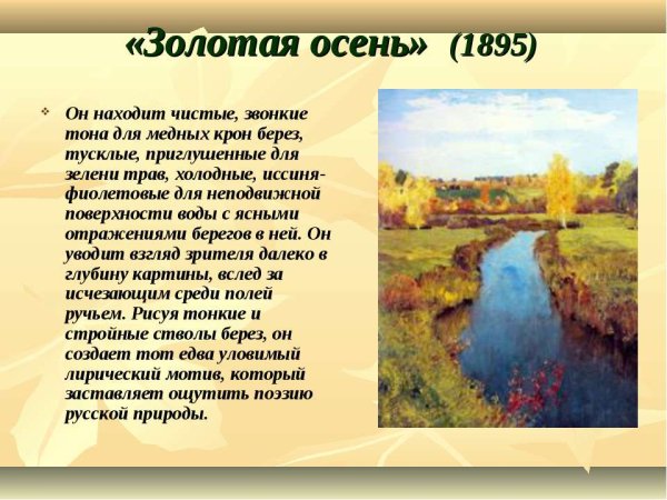 Золотая осень - это живописный сезон, когда природа одевается в самые яркие и теплые оттенки. Картина Льва Левитана "Золотая осень" прекрасно передает всю красоту и магию этого времени года. В ее сюжете можно увидеть золотистые поля, покрытые листьями разных оттенков, которые словно танцуют на ветру. Небо также окутано золотистым светом, создавая атмосферу тепла и умиротворения. Эта картина Левитана вызывает чувство спокойствия и радости, позволяя нам насладиться прелестями осени и вдохнуть ее волшебный дух.