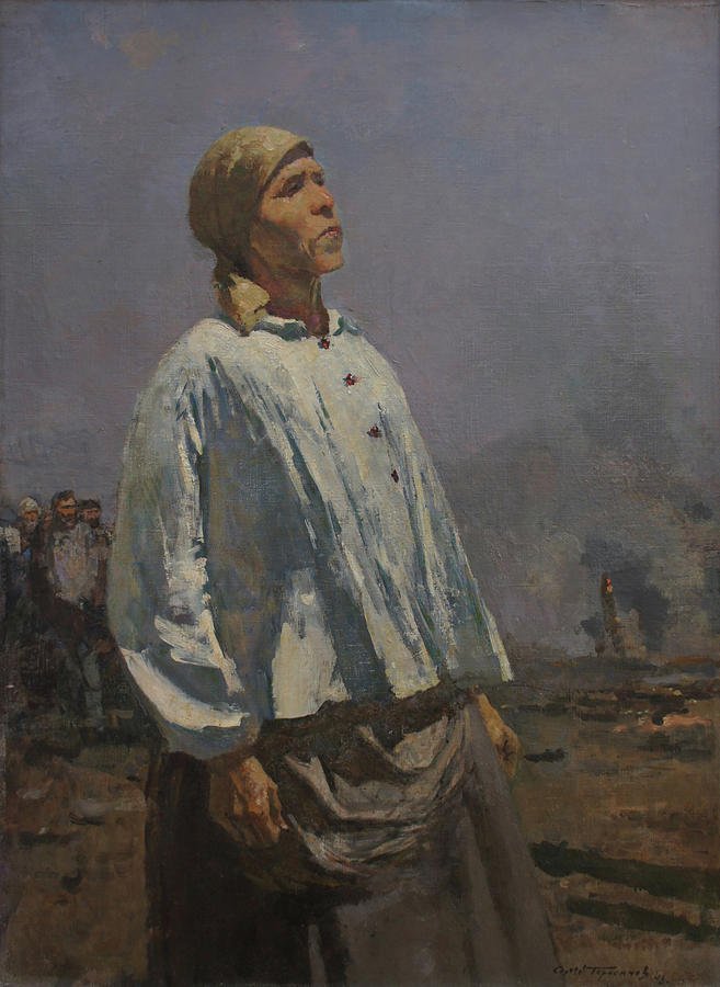 "Мать партизана Герасимов" - картина, которая воплощает историческую тему и передает мощное эмоциональное послание. В этом произведении искусства художник создал образ сильной и непоколебимой женщины, матери героя-партизана. Картина выражает глубокие чувства и сострадание к людям, которые борются за свободу и идеалы. Яркие цвета и детали позволяют зрителю полностью погрузиться в атмосферу того времени и почувствовать настоящую силу и мужество матери, которая поддерживает своего сына в его борьбе. "Мать партизана Герасимов" является важным и значимым произведением искусства, которое удивляет своей глубиной и вызывает глубокие эмоции у зрителя.