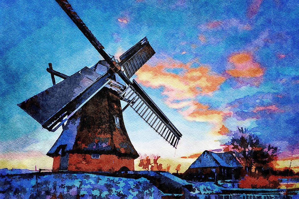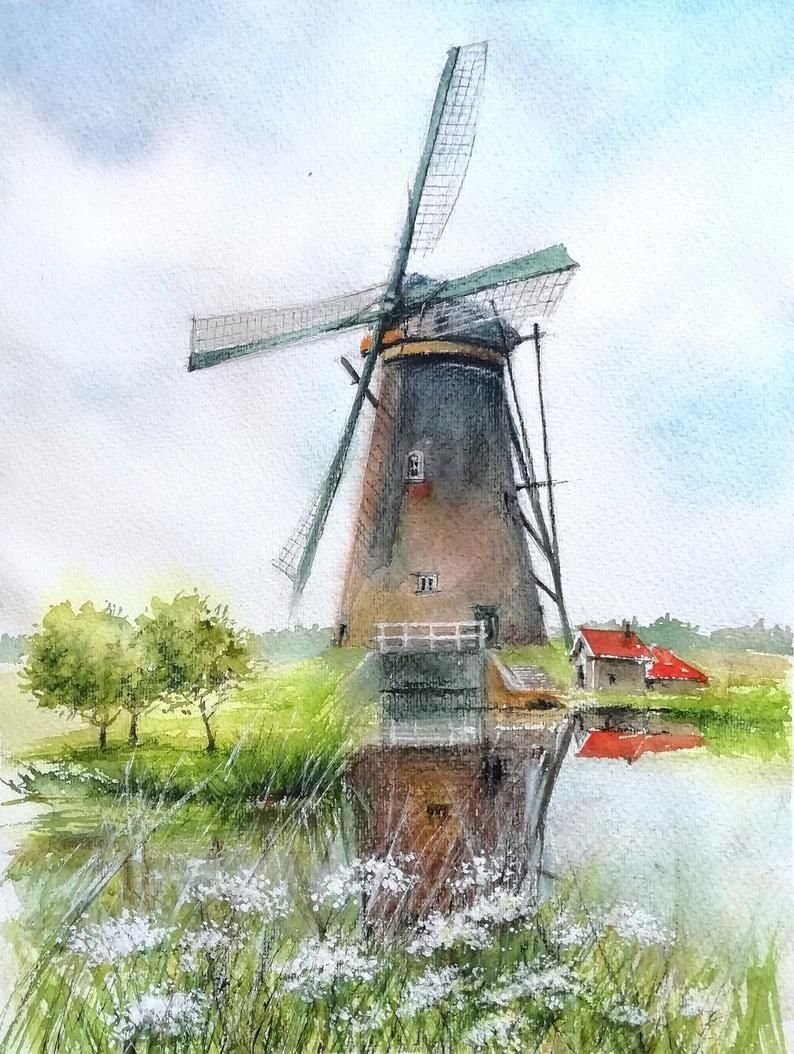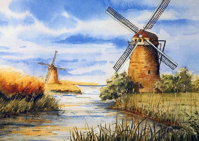 Ветряная мельница акварель