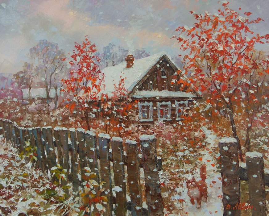 Художник Дмитрий Левин "зимний деревенский пейзаж ".
