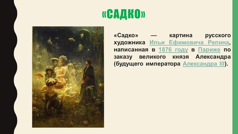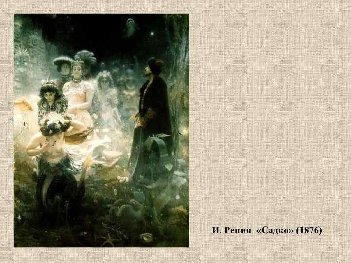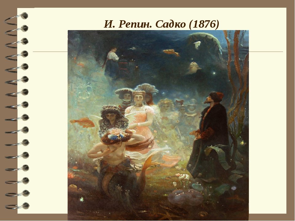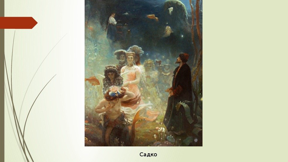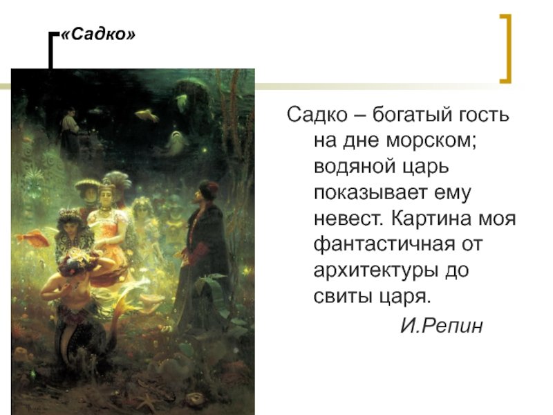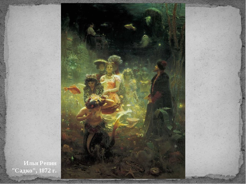 «Садко» - это знаменитая картина русского художника Ильи Ефимовича Репина. На этой полотне изображена сцена из народной легенды о Садко, молодом русском гусляре, который способен очаровывать своей музыкой не только людей, но и подводных жителей. Картина воссоздает яркий и динамичный момент, когда Садко играет на гуслях, окруженный большой толпой народу и морских обитателей. Это произведение отличается богатством деталей, проникновенными выразительными лицами персонажей и величественной композицией. «Садко» - это настоящий шедевр, который запечатлел сказочную атмосферу древней русской легенды и является одним из самых известных произведений Репина.