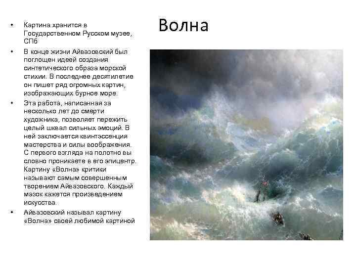 Великий русский художник Иван Айвазовский создал множество непревзойденных картин, на которых изображены морские волны. Одна из самых знаменитых его работ - картина "Среди волн". На этом полотне художник передает всю силу и величие природного элемента. Каждая волна нарисована с невероятной детализацией, передавая свою энергию и движение. При взгляде на эту картину, можно почувствовать себя погруженным в бурное море, слышать шум волн и ощущать их мощь. "Среди волн" - это произведение искусства, способное привлечь внимание любого ценителя искусства и позволить ему погрузиться в уникальный мир морских просторов.