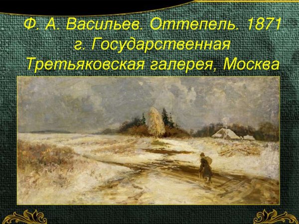 "Оттепель" - картина, созданная талантливым художником Васильевым. Это произведение искусства восхищает своей неповторимой атмосферой и глубоким содержанием. На холсте переданы мгновения послевоенного периода, когда страна сменила режим и начала преображаться. В каждой детали можно увидеть отражение перемен, эмоций и надежд, которые охватили людей того времени. Картина "Оттепель" позволяет нам окунуться в то время и почувствовать на себе его влияние, вызывая размышления о прошлом и будущем.