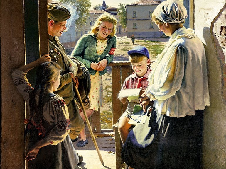 "Картина "Письмо с фронта" Лактионова - это произведение искусства, которое захватывает зрителя своей интенсивностью и эмоциональной глубиной. В нем художник передает неподдельные чувства и настроение военного времени, показывая трагедию и болезненность военных действий. На холсте можно увидеть солдата, сидящего на заднем фоне, напряженно пишущего письмо своим близким. Его выразительное лицо, наполненное страстью и сожалением, является отражением всего мужества и стойкости, которые требуются во время войны. Каждая кисточка художника передает сложность внутреннего мира героя, а яркие цвета создают ощущение реальности и проникающей энергии."