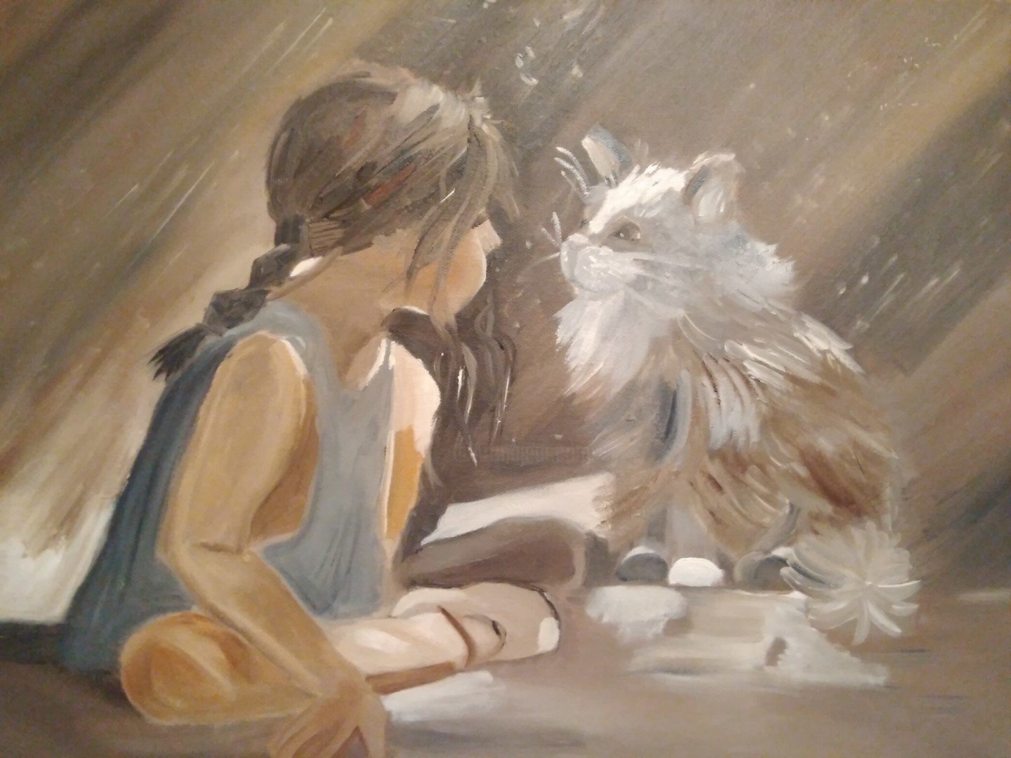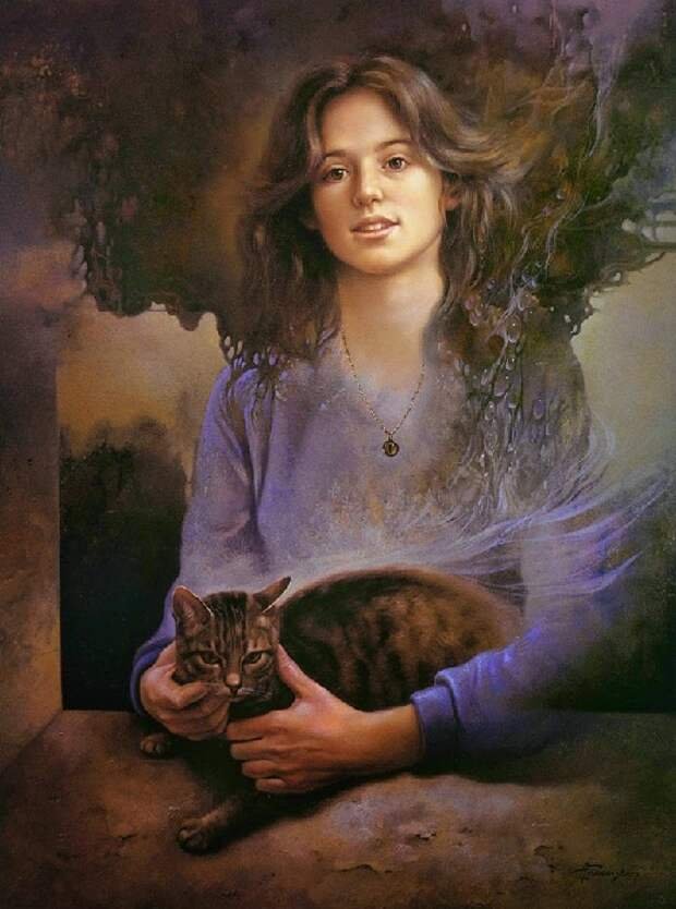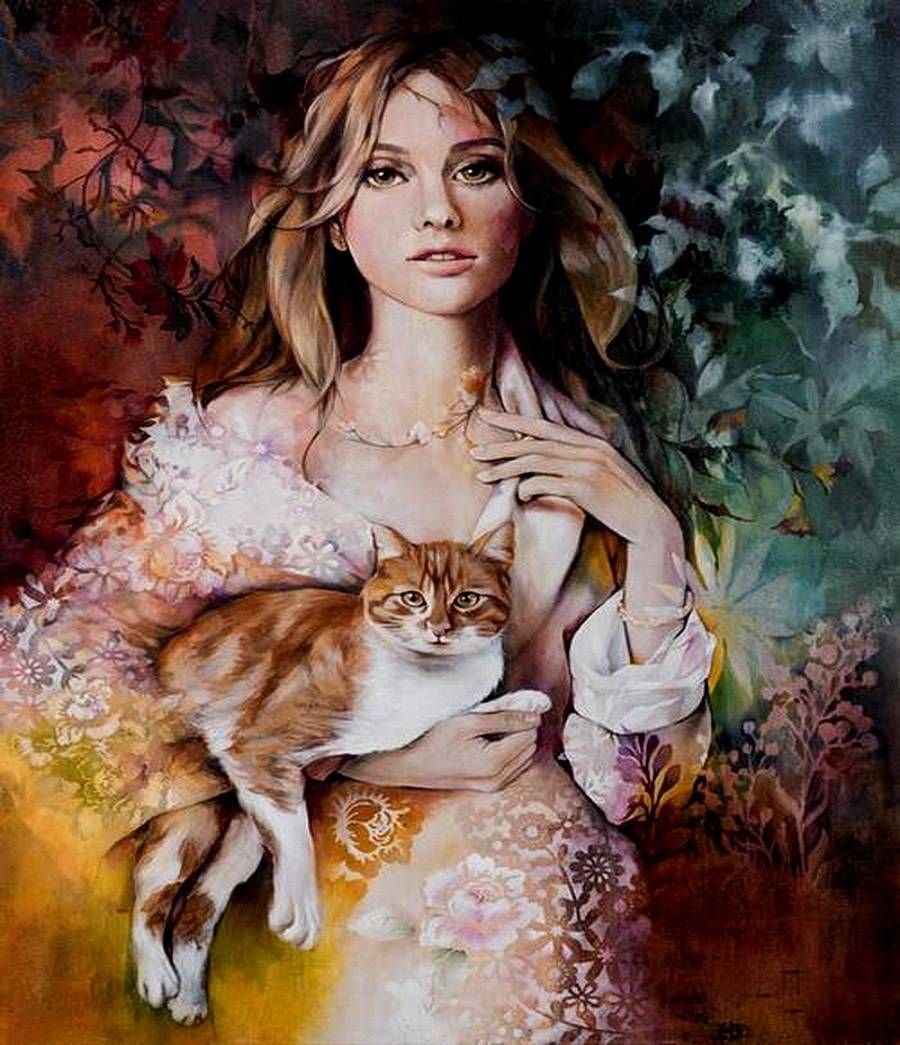Девушка и кошка живопись