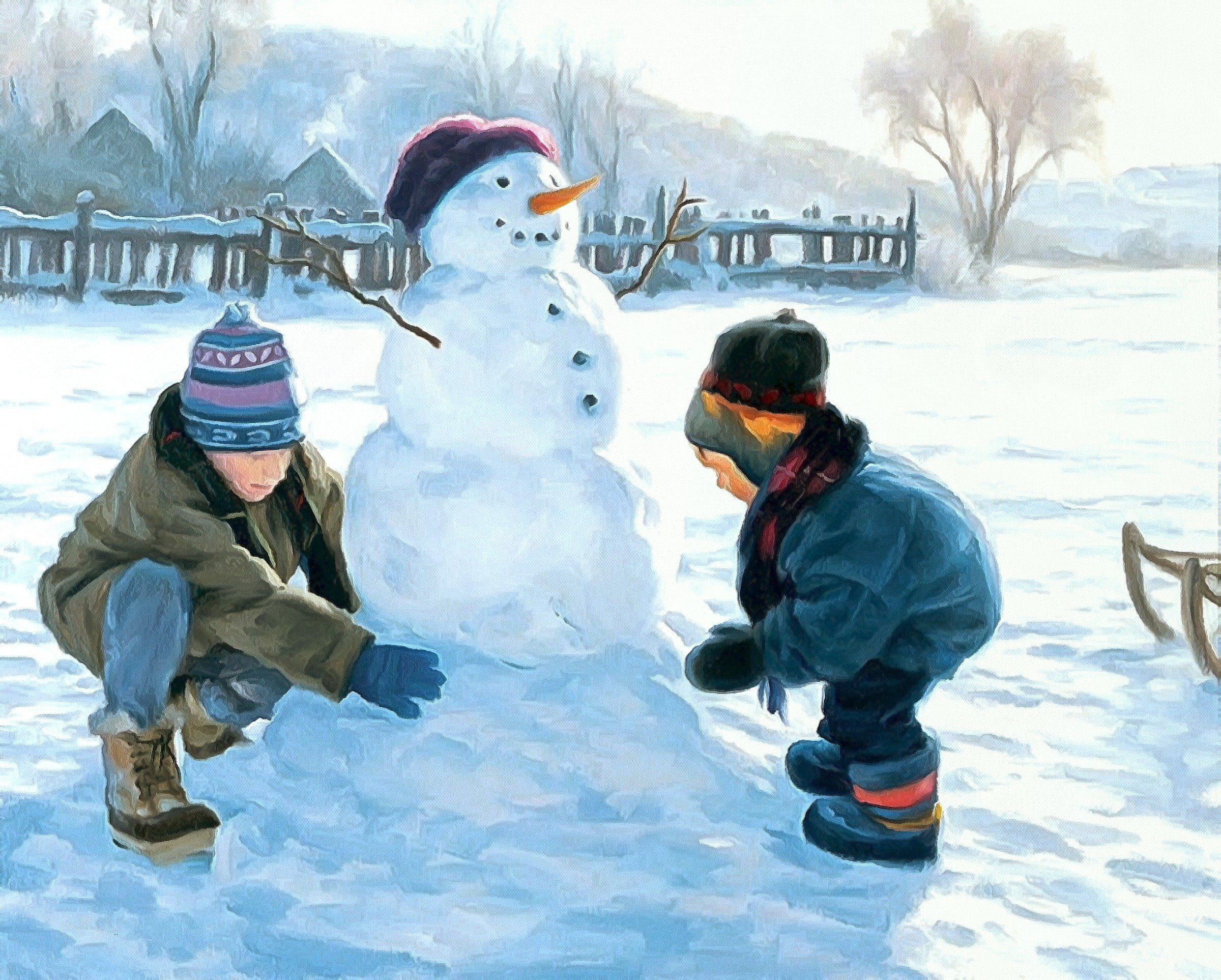Дети строят снеговика