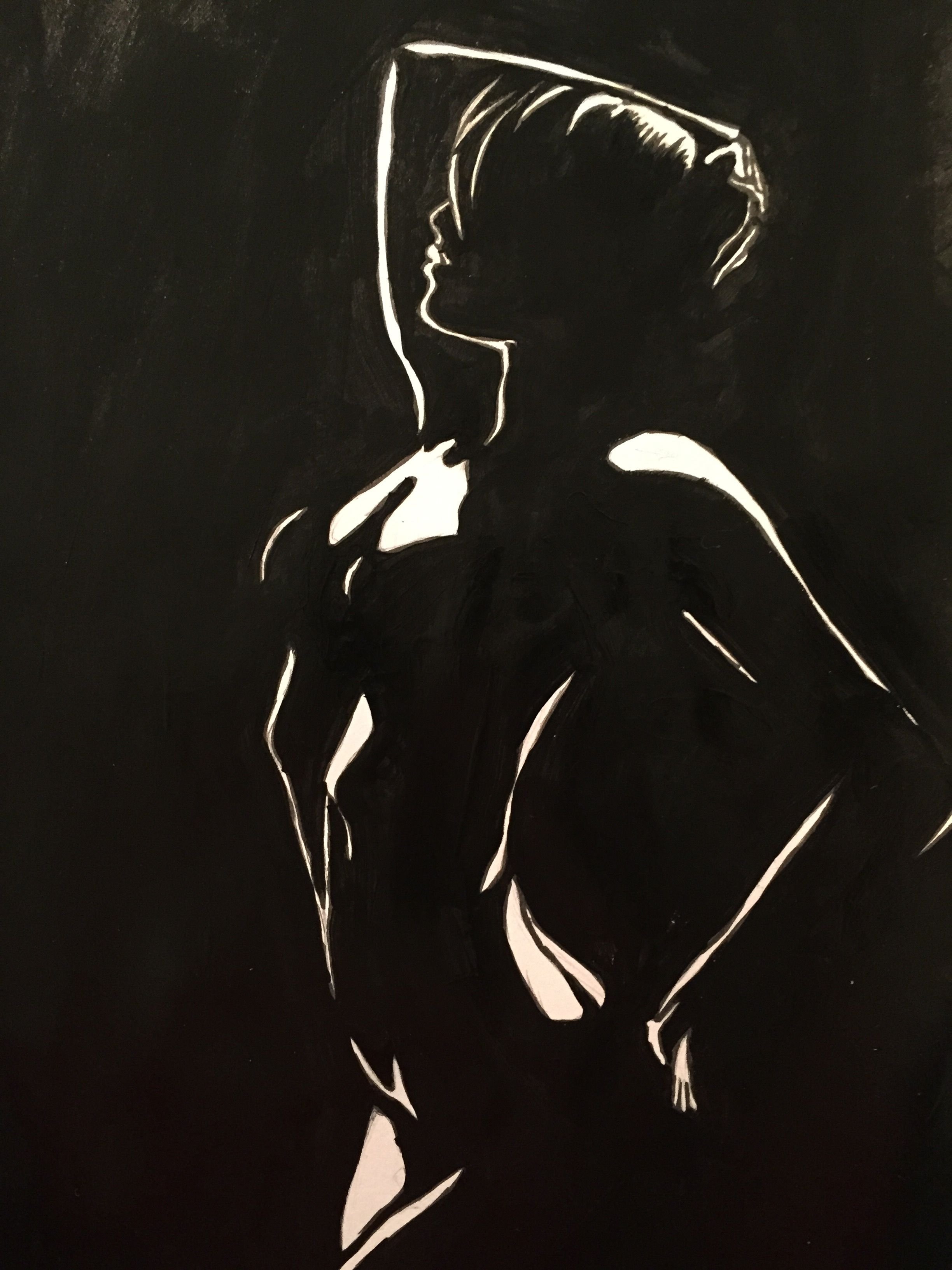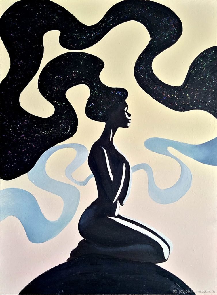 привлекает внимание. Ее изящные контуры и грациозная поза создают впечатление легкости и элегантности. Через тонкие линии художник передает нежность и красоту женской фигуры. Возможно, девушка находится в движении или моменте задумчивости, что добавляет загадочности и интереса к ее образу. Благодаря своей точности и простоте, силуэт дополняет общую композицию и придает картине особый шарм.