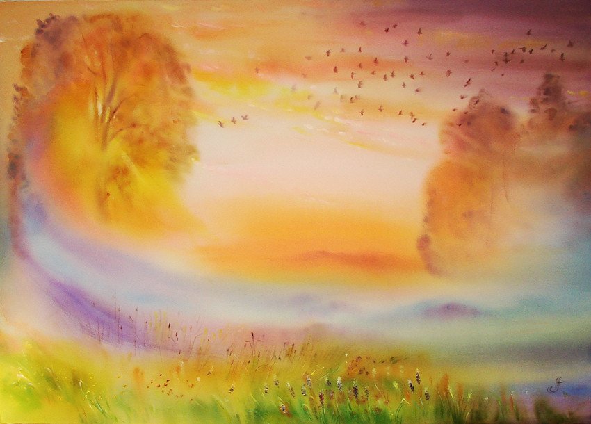 Пейзаж в теплых тонах акварель