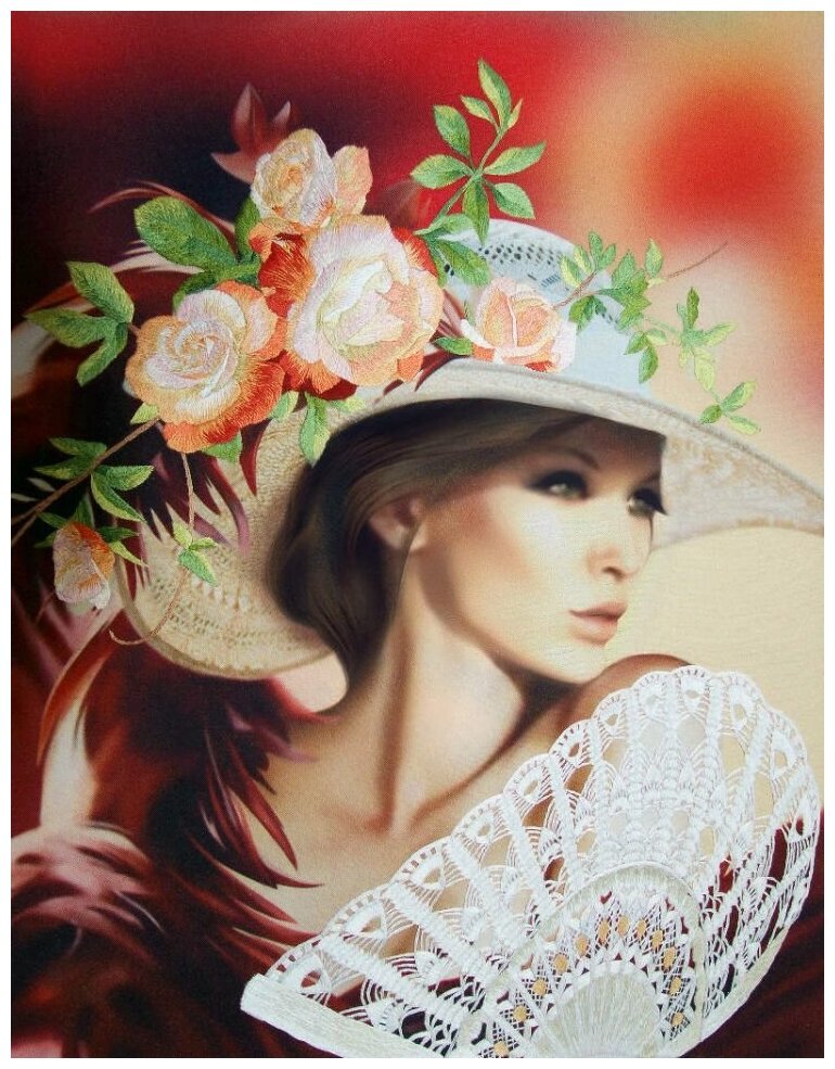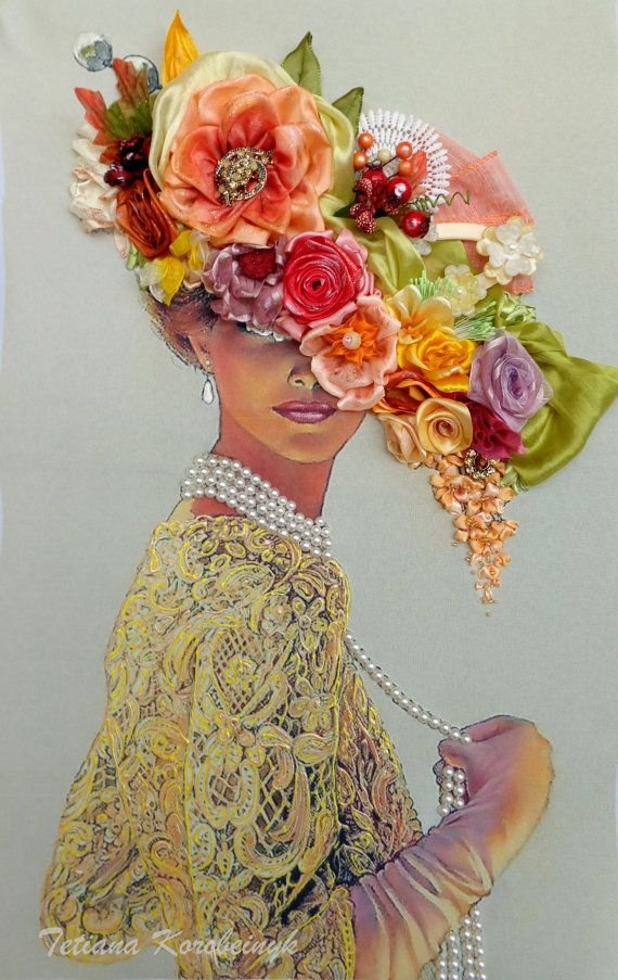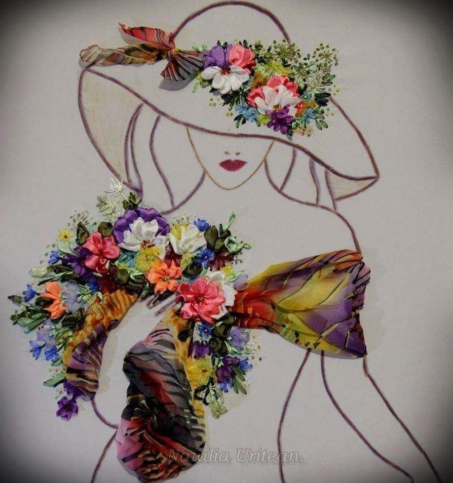 Вышивка лентами дама в шляпе