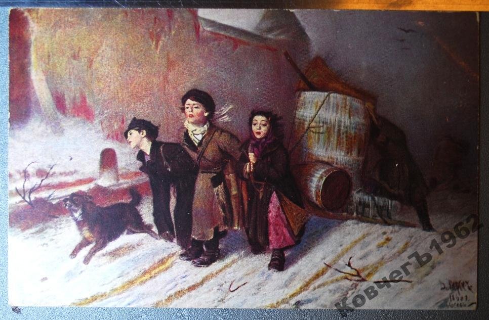 Картина дети тащат сани с бочкой воды