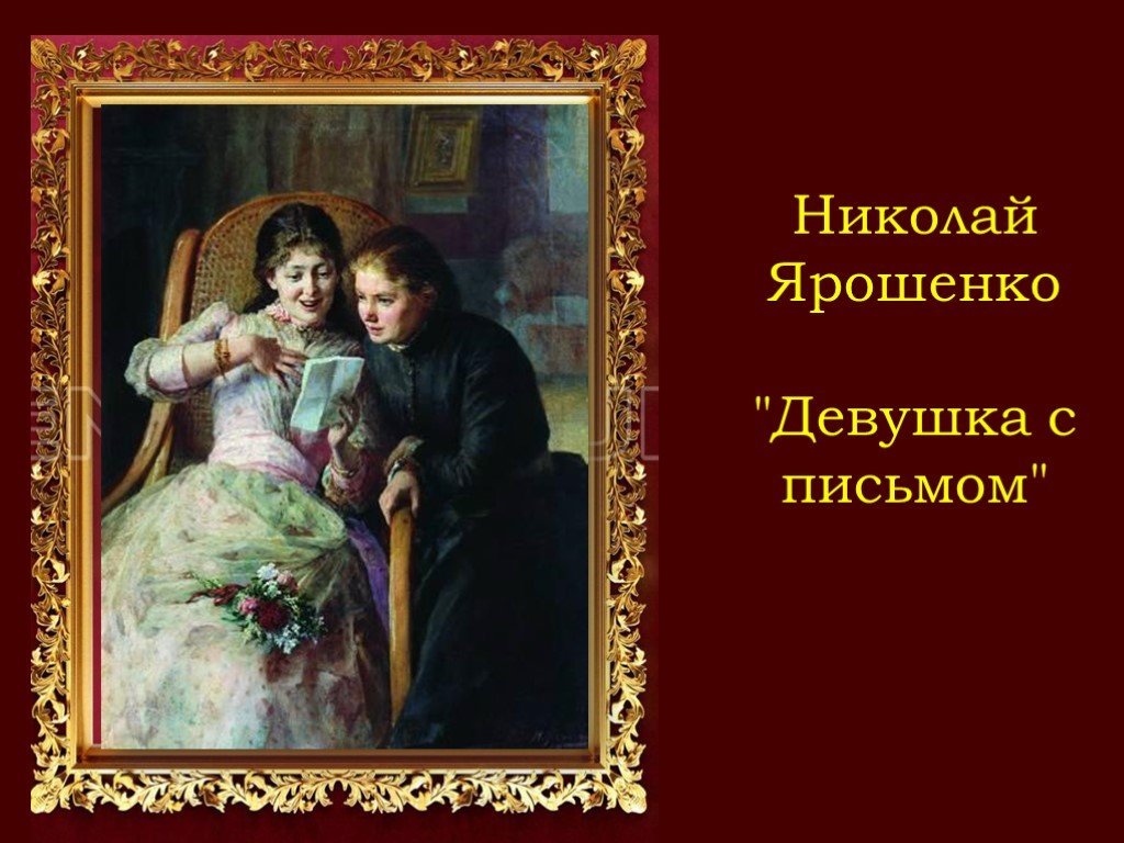 Картина "Девушка с письмом" Ярошенко - это произведение искусства, которое восхищает своей нежностью и таинственностью. В центре картины изображена молодая женщина, держащая в руках письмо. Ее лицо выражает смесь эмоций: от ожидания до тревоги. Каждая деталь на полотне передает глубокий смысл, будь то ее одежда, расположение фигуры или игра света и тени. Работа художника Аркадия Александровича Ярошенко затягивает зрителя в мир интриги и загадочности, вызывая интерес и вопросы о содержании таинственного письма и его влиянии на душевное состояние героини. Эта картина является прекрасным примером того, как искусство может воплотить человеческие эмоции и заставить зрителя задуматься о скрытых смыслах и истории, которые стоят за каждым произведением искусства.