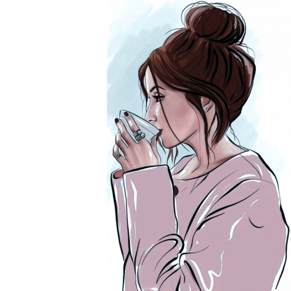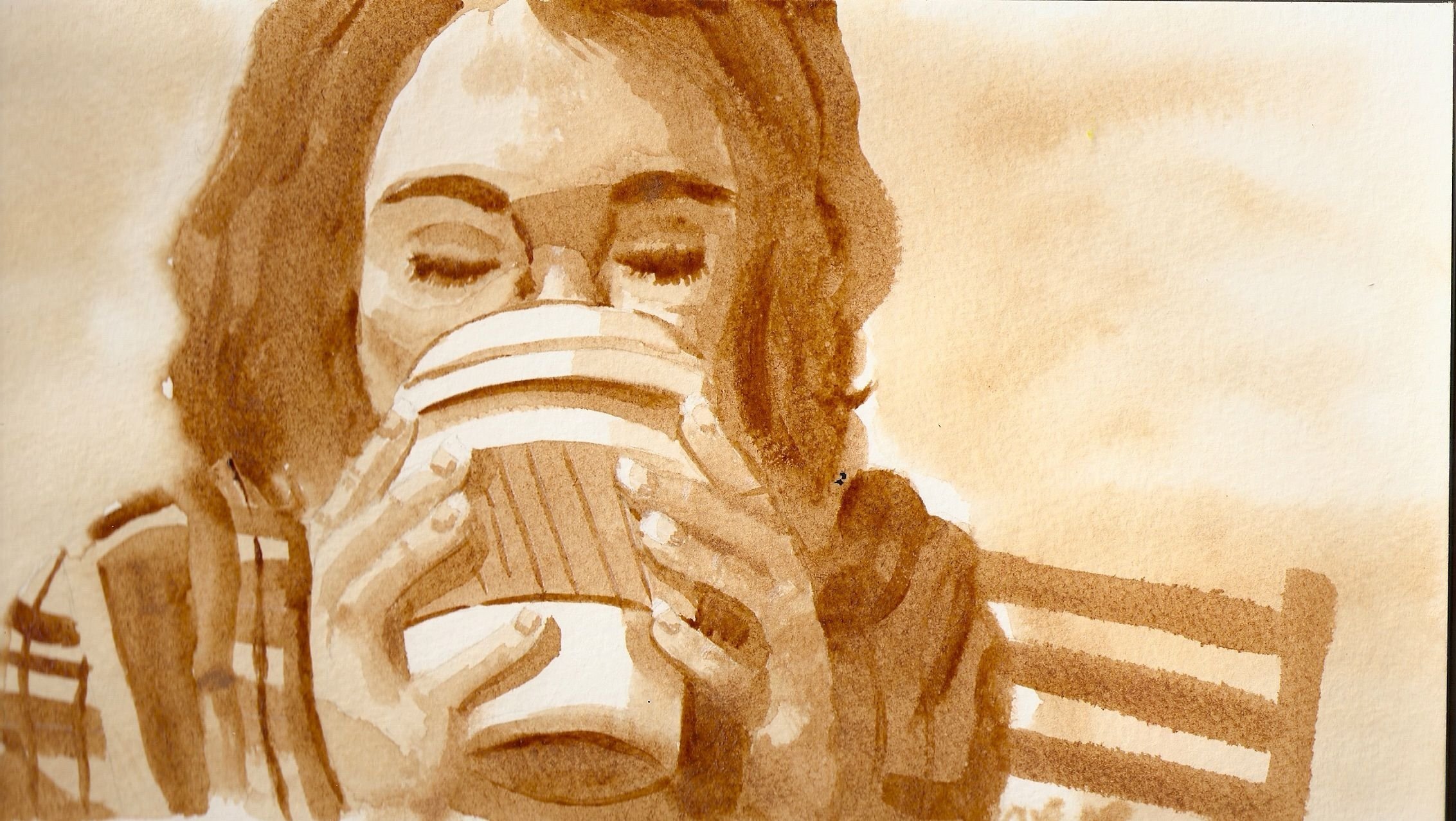 Девушка пьет кофе акварель