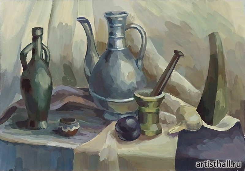 Великолепный натюрморт, созданный мастерским образом в холодных тонах гуашью, привлекает внимание своей эстетикой и тонкостью исполнения. Картина окутана атмосферой спокойствия и таинственности, которая переносит зрителя в мир загадочных оттенков. Холодные тона нежно переплетаются на холсте, создавая ощущение прохлады и легкого морозного дыхания. В каждом элементе композиции можно увидеть гармонию и баланс: цветочные бутончики, стеклянные предметы и плоды выражены с изящностью и реалистичностью. Натюрморт в холодных тонах гуашью - это настоящее произведение искусства, которое подарит вам эстетическое наслаждение и придется по душе любителям тонких художественных изысков.