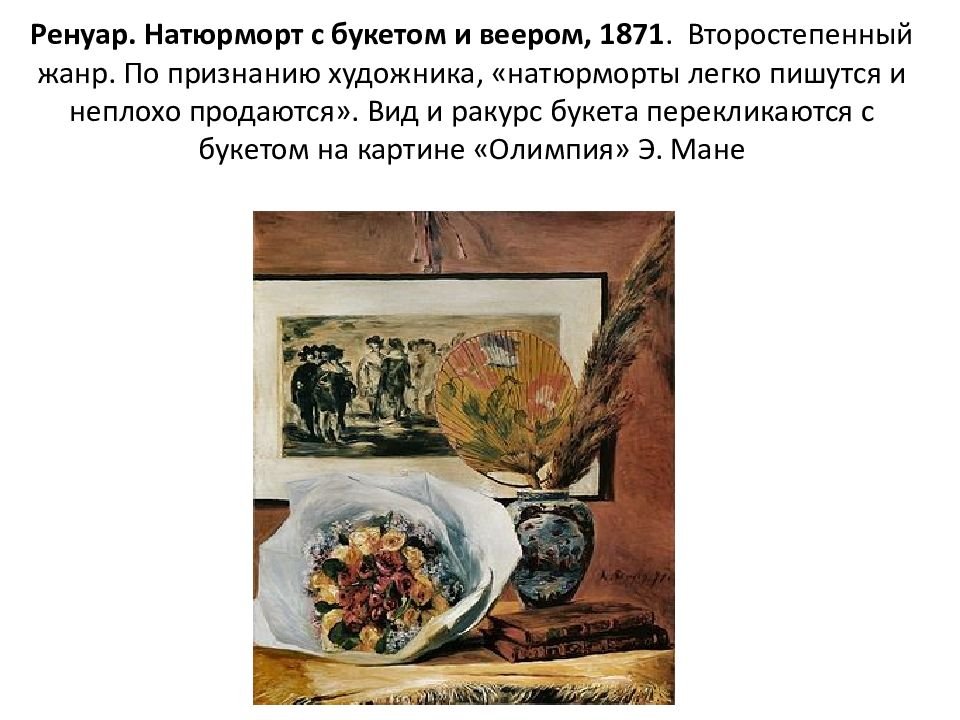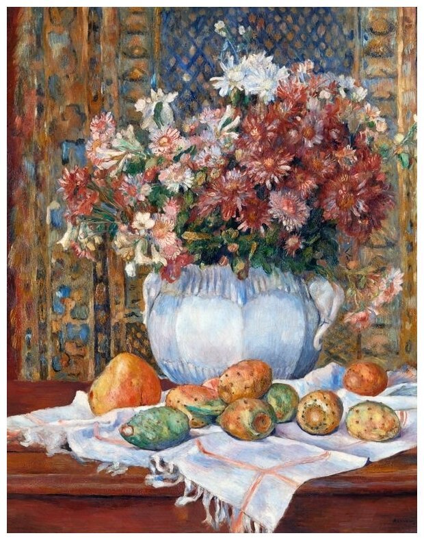 Ренуар – великий французский художник, известный своими яркими и живописными произведениями. В его работах он умело передавал красоту и естественность окружающего мира. Одним из замечательных натюрмортов Ренуара является картина с букетом цветов и веером. Нежные оттенки цветов и детальная проработка каждого элемента делают эту работу поистине прекрасной. Букет цветов, состоящий из разнообразных оттенков, создает атмосферу свежести и жизни. Веер, расположенный рядом с ним, добавляет картине шарма и загадочности. Каждая кисть художника словно оживляет предметы на полотне, позволяя зрителю окунуться в мир красоты и эстетики. Это произведение искусства наполнено гармонией и чувственностью, что делает его настоящим воплощением мастерства Ренуара.