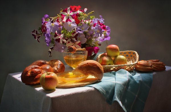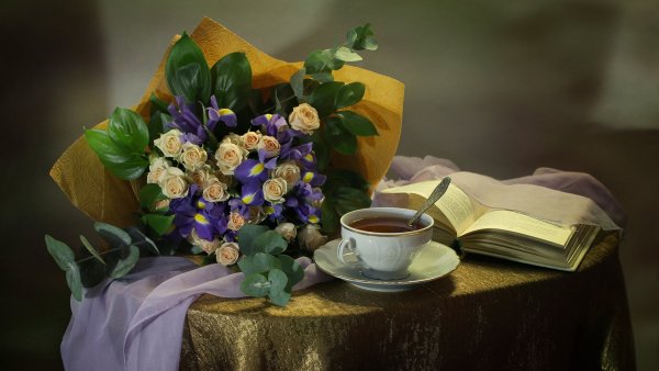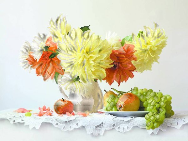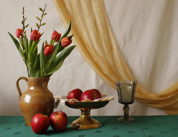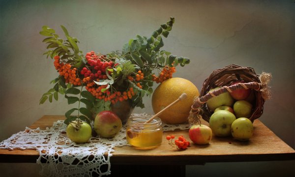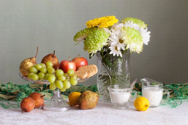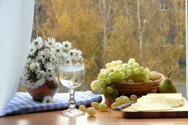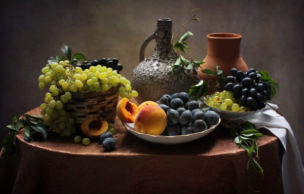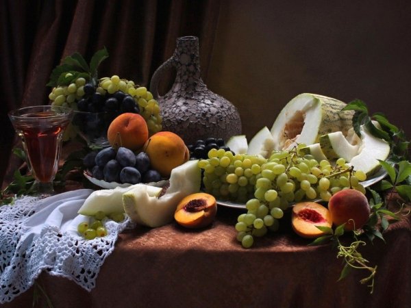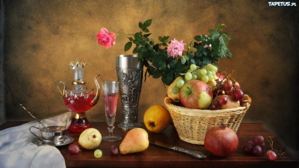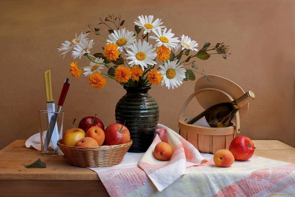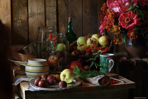 Представь себе уютную комнату с деревянным столом, на котором разложен натюрморт. Яркие цвета и сочные оттенки заставляют взгляд остановиться на этой картины природы и ее изяществе. На столе расположены свежие фрукты разных сортов и цветов - ярко-красные яблоки, спелые желтые бананы, сочные зеленые груши и апельсины. Они служат не только для украшения интерьера, но и наполняют комнату свежим ароматом. Рядом с фруктами находится праздничная корзинка с ягодами, включая сочные клубнику, чернику и малину. В центре натюрморта стоит букет свежих цветов, состоящий из гладиолусов, лилий, роз и хризантем. Эти яркие и ароматные предметы создают атмосферу радости и летнего настроения, придают особую привлекательность и элегантность комнате. Натюрморт на столе - это источник вдохновения и приятного времяпрепровождения.
