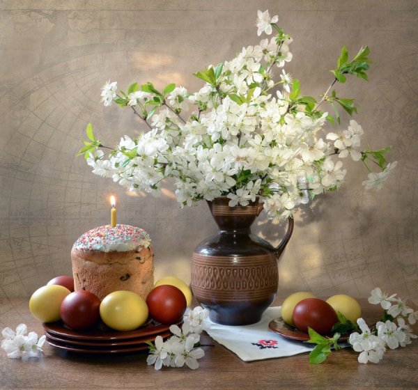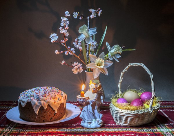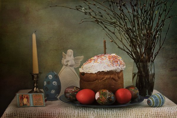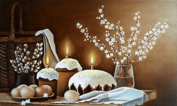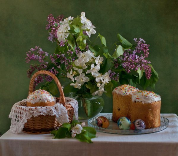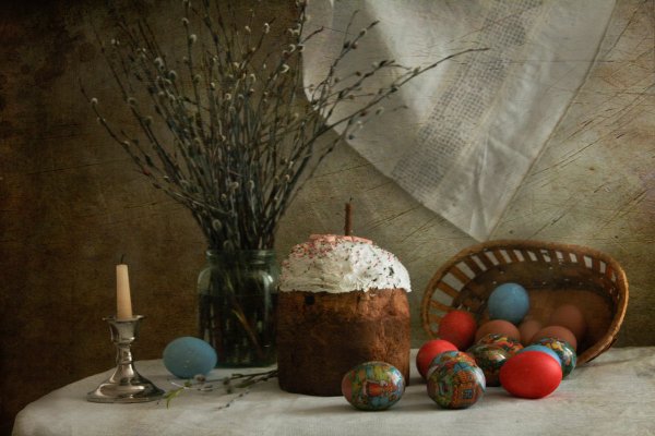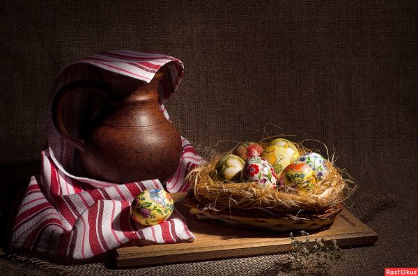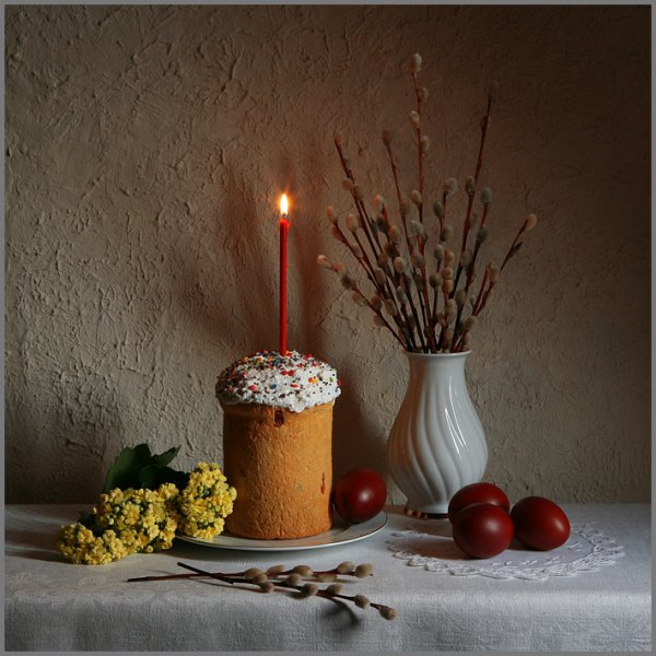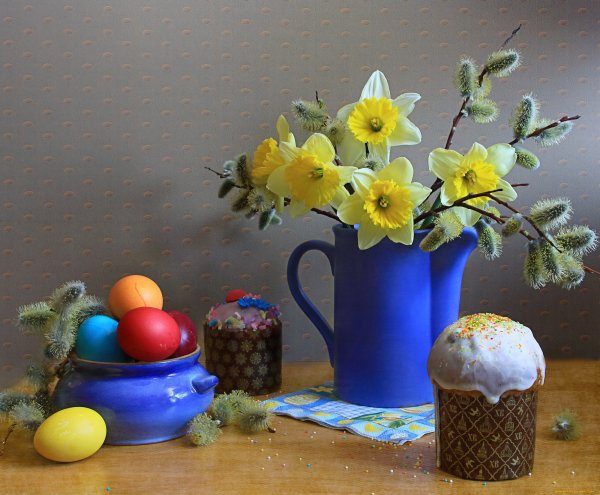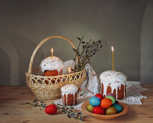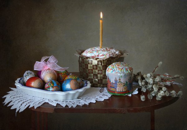 Пасхальный натюрморт - это великолепная композиция из ярких и символичных элементов, которая создает атмосферу праздника и радости. В центре внимания находится красочное пасхальное яйцо, украшенное замысловатыми узорами и рисунками. Оно символизирует новую жизнь, возрождение и надежду. Вокруг яйца расположены свежие цветы, веточки и зелень, придающие композиции естественность и живость. Также необходимым элементом пасхального натюрморта являются разнообразные пасхальные аксессуары - куличи, блины, курица, зайчики и другие символы этого прекрасного праздника. Благодаря тщательно подобранным деталям и гармоничному сочетанию цветов, пасхальный натюрморт становится настоящим украшением интерьера и напоминает о важности семейных традиций и душевной связи.