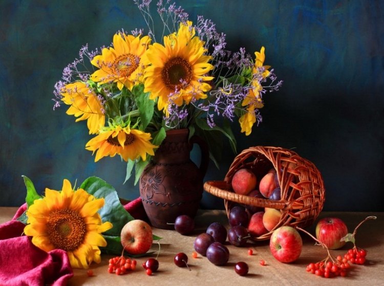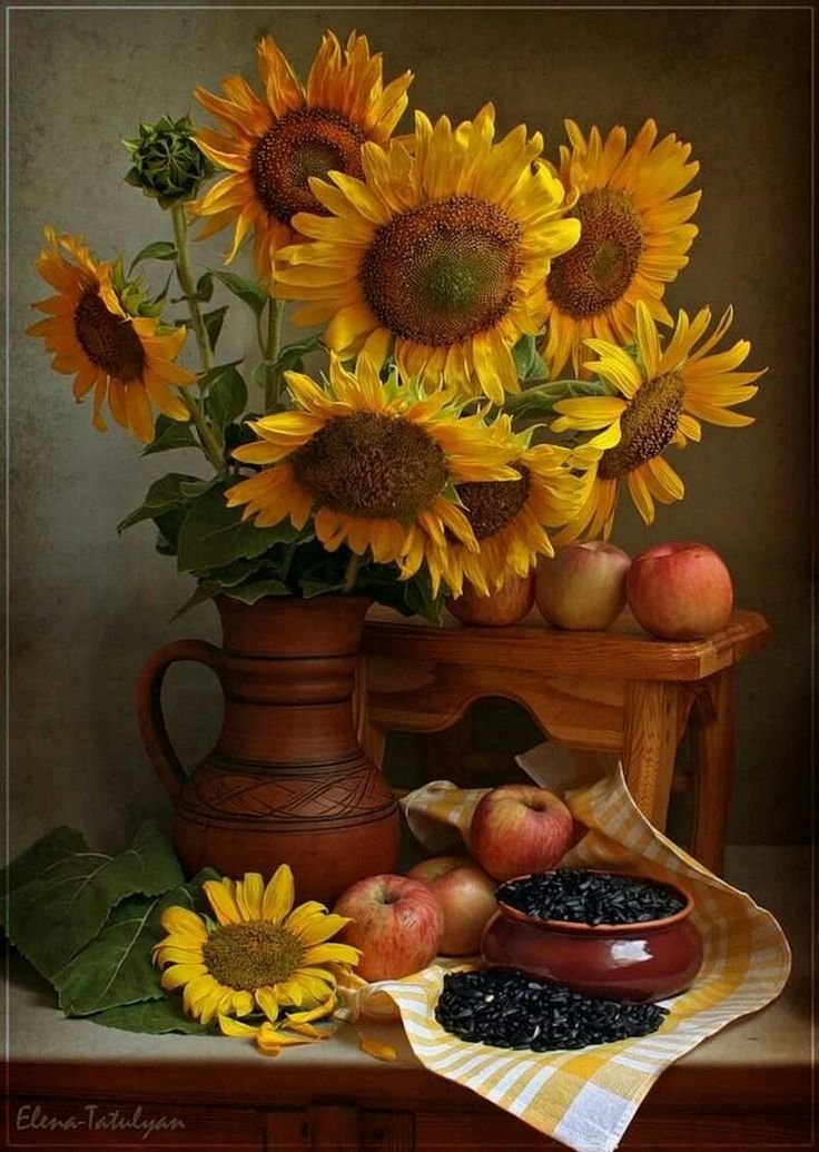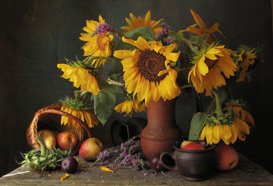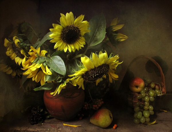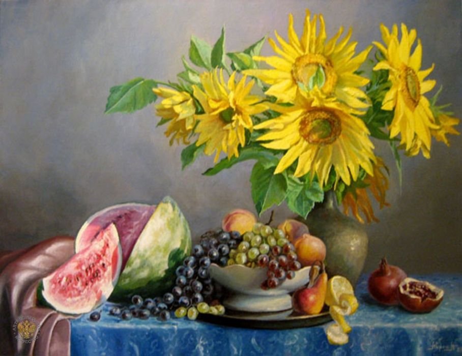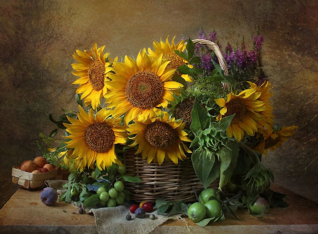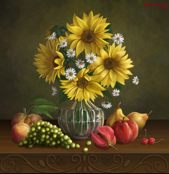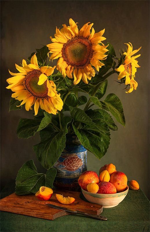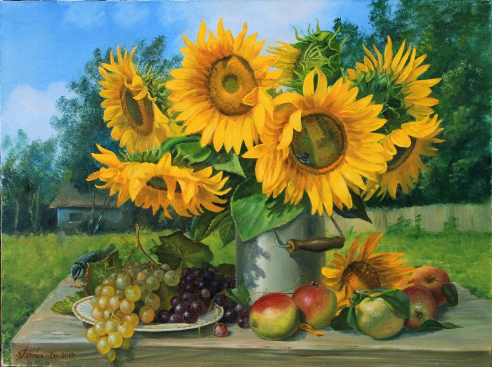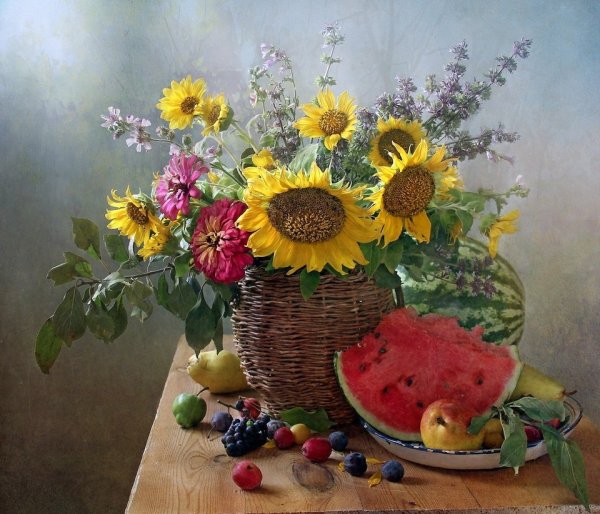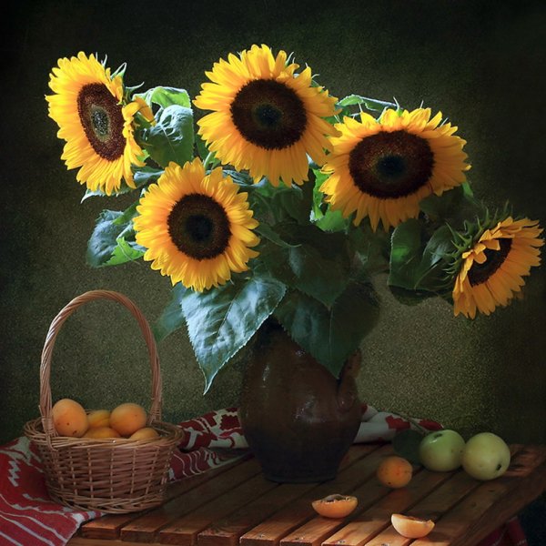 Натюрморт с фруктами и подсолнухами - это изысканное произведение искусства, которое захватывает взгляд своей яркостью и живописностью. Картина передает атмосферу летнего дня, полного тепла и света. На ней изображены сочные, спелые фрукты разных сортов - яркие яблоки, сладкие груши, сочные персики, а также пышные букеты подсолнухов, символизирующие радость и солнечную энергию. Каждая деталь картины, каждый цвет и оттенок наполняют ее прекрасной гармонией и придают особый шарм. Этот натюрморт станет отличным украшением интерьера, добавит в него нотки природной красоты и жизни.