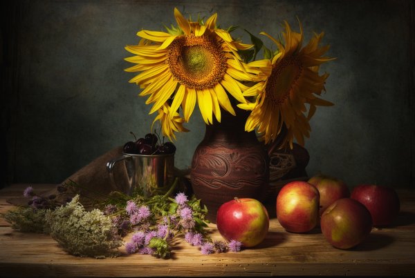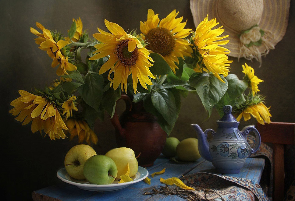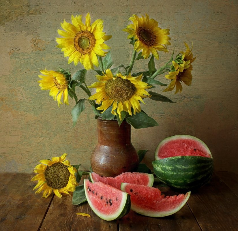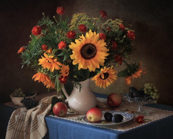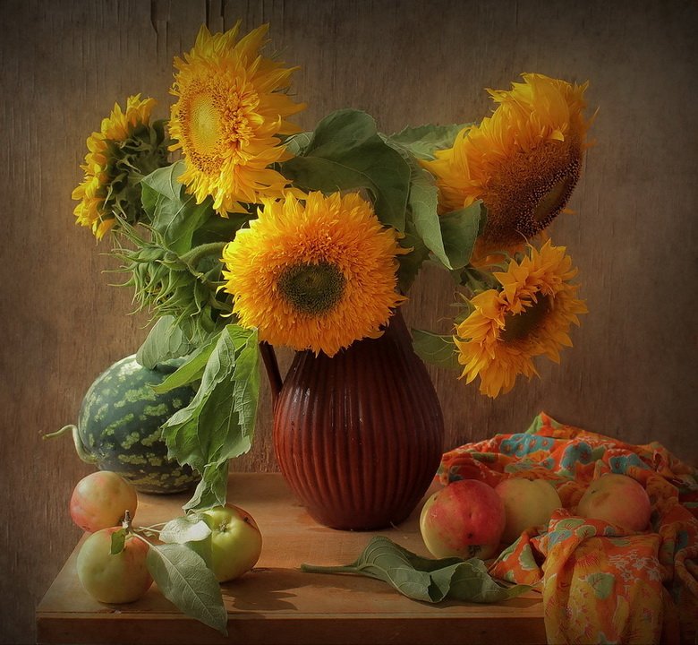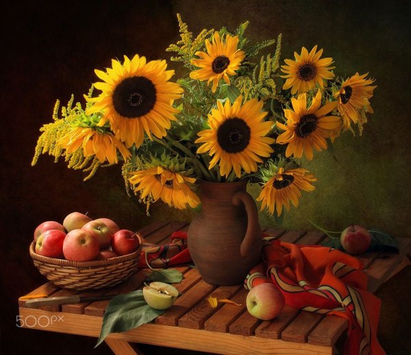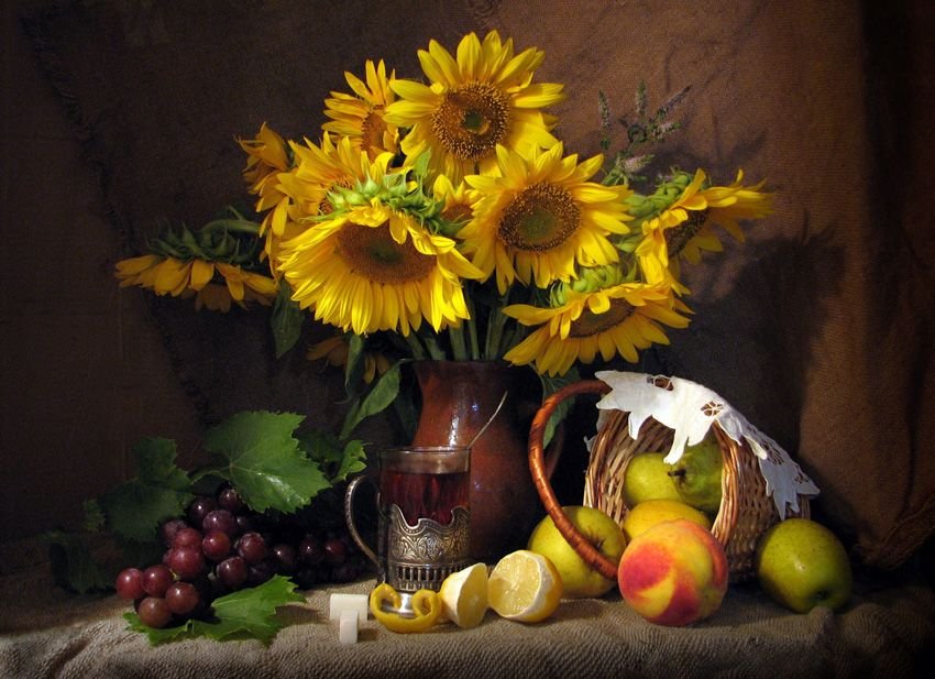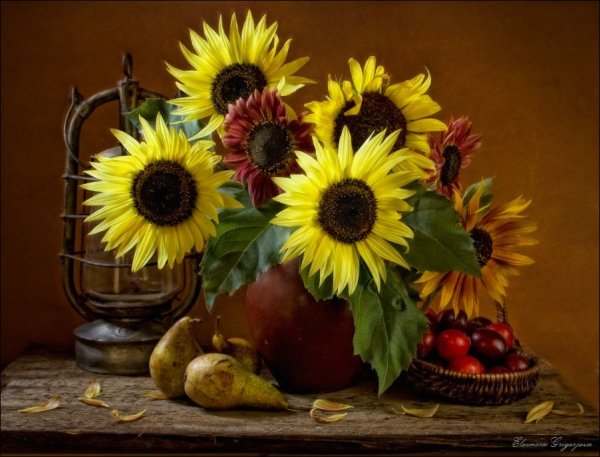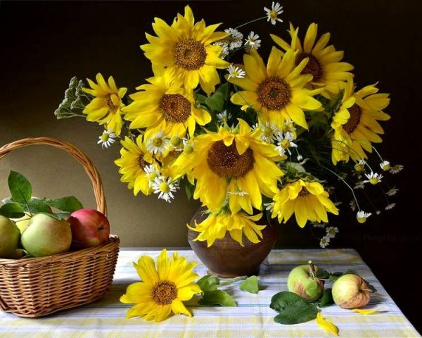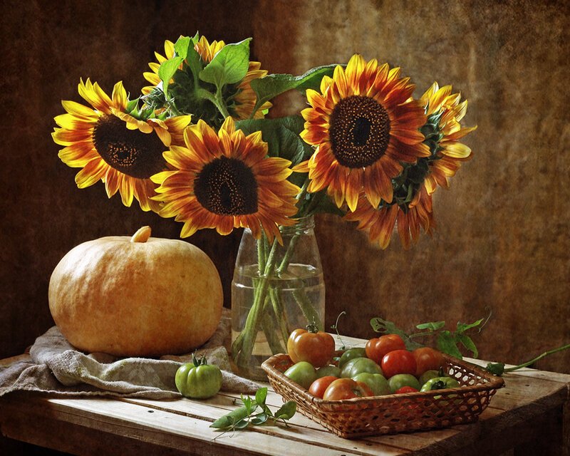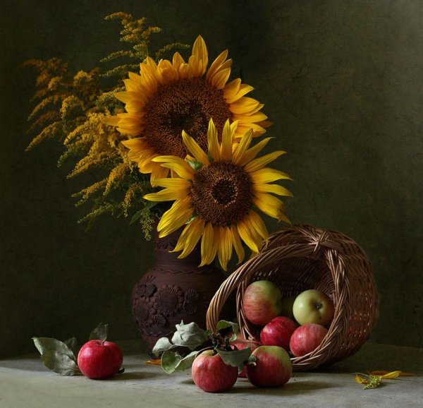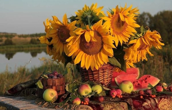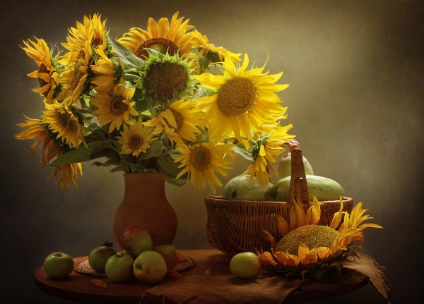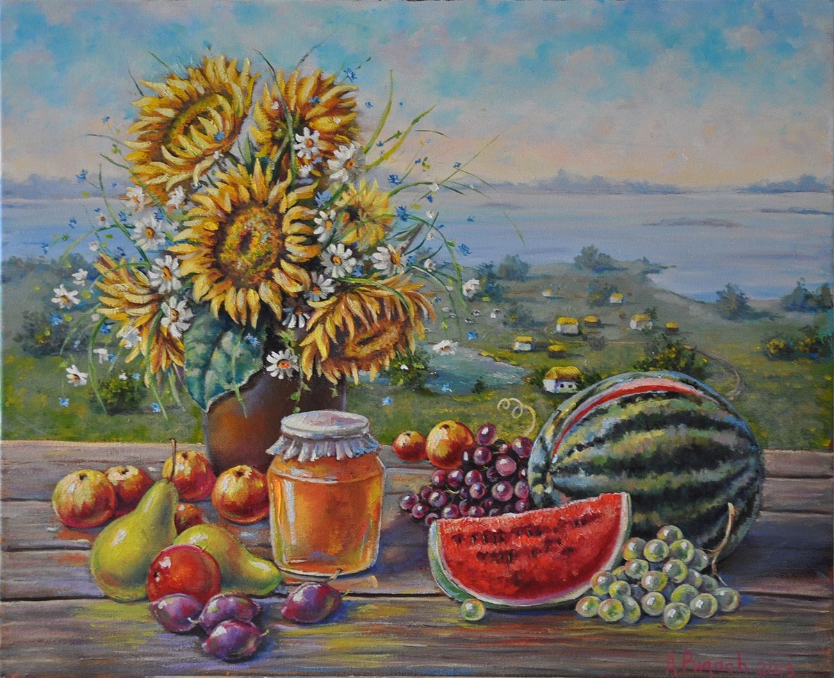 Натюрморт с фруктами и подсолнухами - это изысканное произведение искусства, которое захватывает взгляд своей яркостью и живописностью. Картина передает атмосферу летнего дня, полного тепла и света. На ней изображены сочные, спелые фрукты разных сортов - яркие яблоки, сладкие груши, сочные персики, а также пышные букеты подсолнухов, символизирующие радость и солнечную энергию. Каждая деталь картины, каждый цвет и оттенок наполняют ее прекрасной гармонией и придают особый шарм. Этот натюрморт станет отличным украшением интерьера, добавит в него нотки природной красоты и жизни.