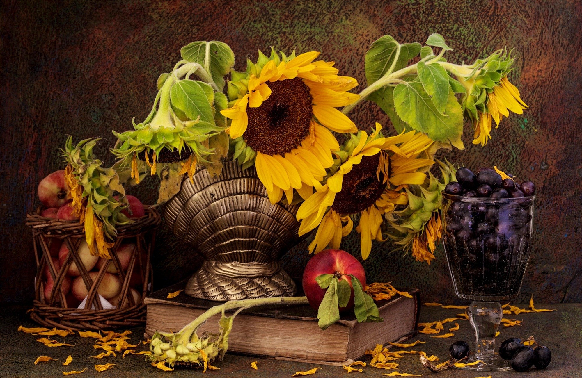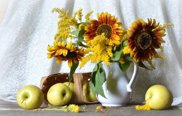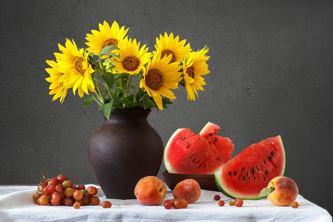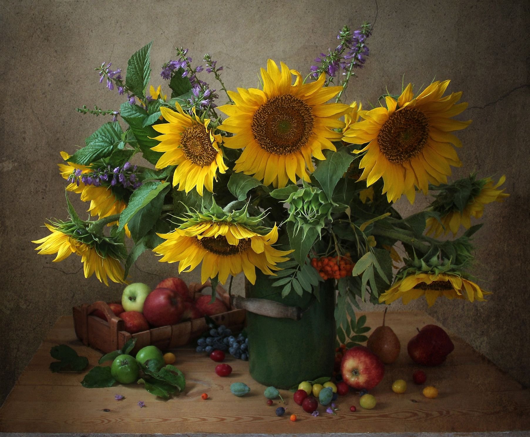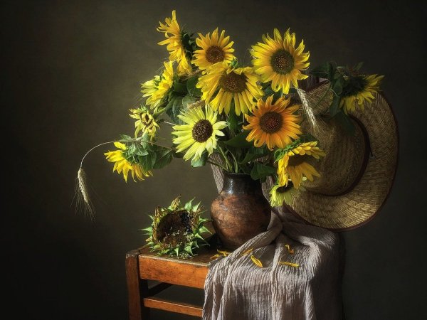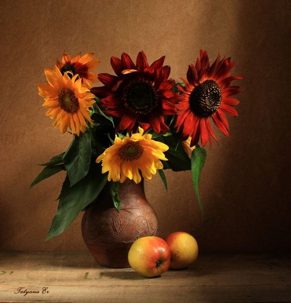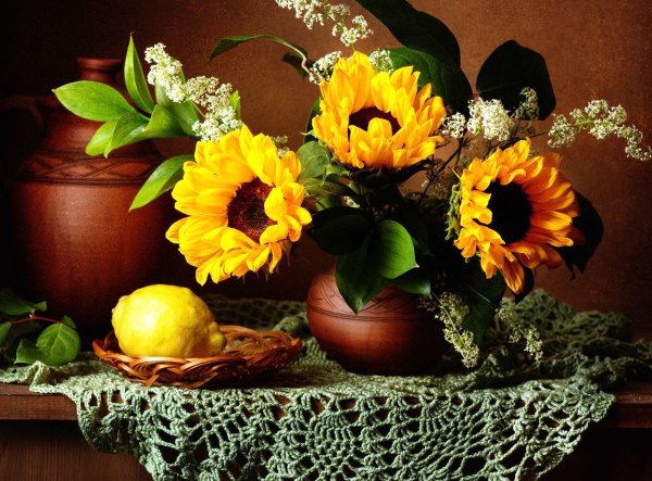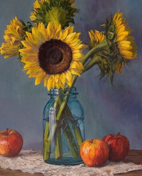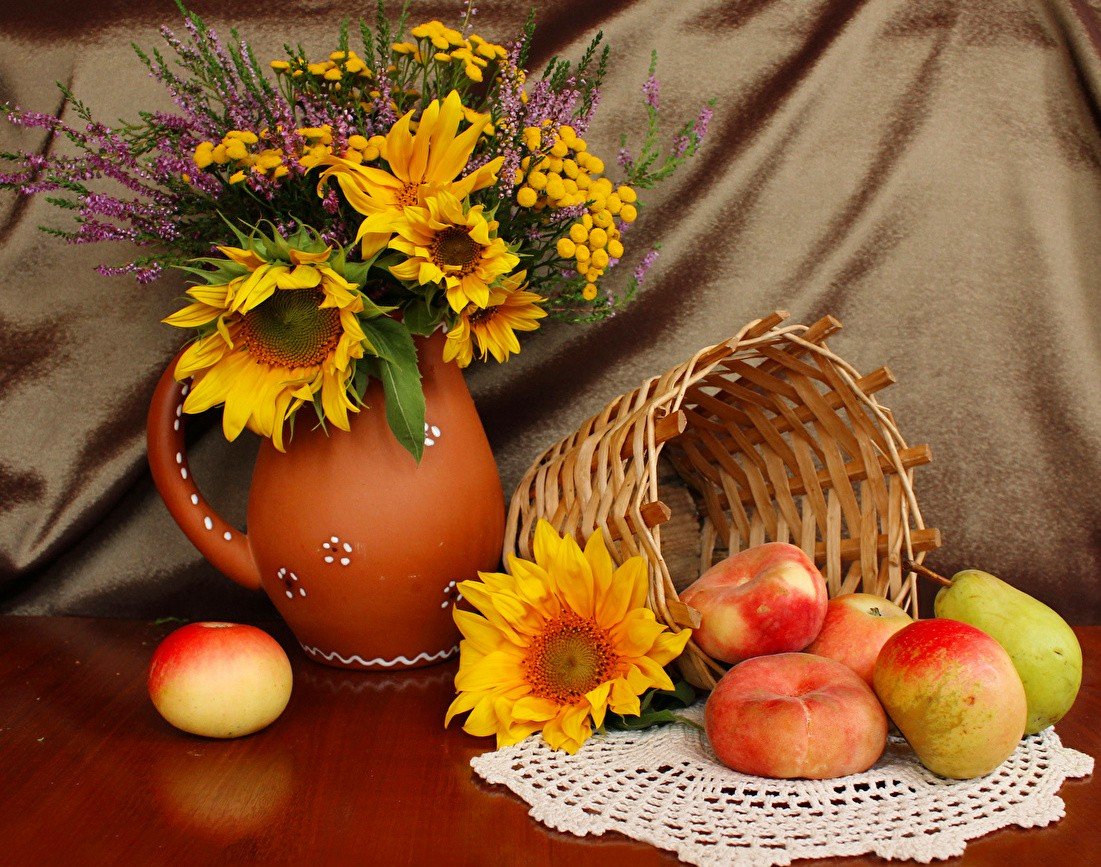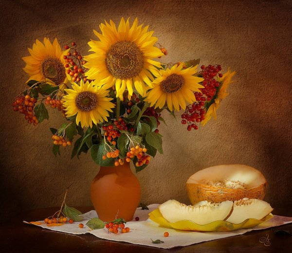 Натюрморт с фруктами и подсолнухами - это изысканное произведение искусства, которое захватывает взгляд своей яркостью и живописностью. Картина передает атмосферу летнего дня, полного тепла и света. На ней изображены сочные, спелые фрукты разных сортов - яркие яблоки, сладкие груши, сочные персики, а также пышные букеты подсолнухов, символизирующие радость и солнечную энергию. Каждая деталь картины, каждый цвет и оттенок наполняют ее прекрасной гармонией и придают особый шарм. Этот натюрморт станет отличным украшением интерьера, добавит в него нотки природной красоты и жизни.