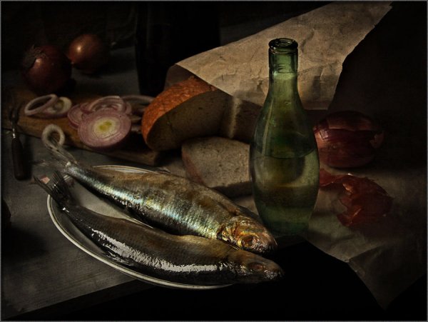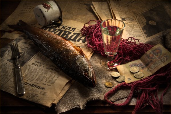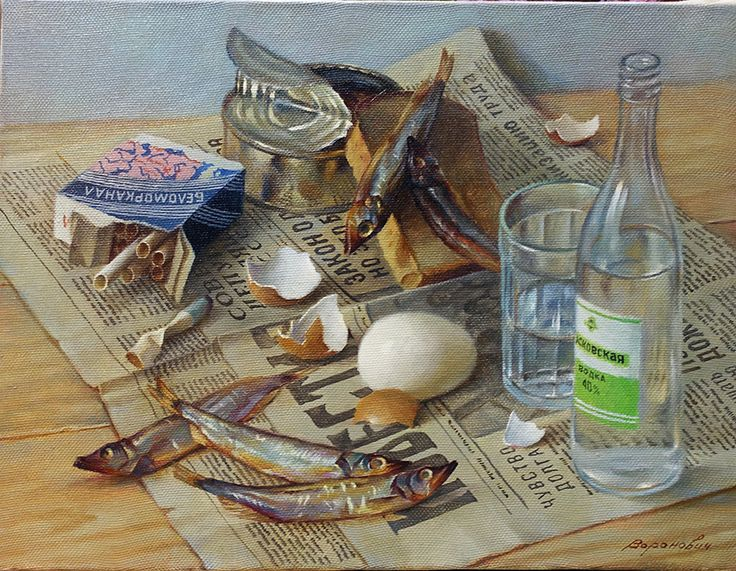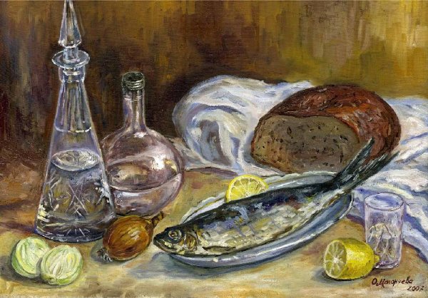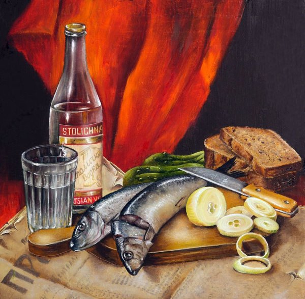 Натюрморт с водкой и рыбой - это произведение искусства, которое восхищает своей гармонией и оригинальностью. В этом натюрморте изображены детали, характерные для русской традиции - бутылка водки и свежая рыба. Мастерски переданные текстуры и цветовые акценты создают уникальную атмосферу и придают работе особый шарм. Зритель не может не погрузиться в атмосферу трапезы, представляя себя на месте гурмана, наслаждаясь изысканными вкусами и ароматами. Это произведение идеально подходит для оформления интерьера кухни или ресторана, добавляя в него уют и эстетическую привлекательность. Оно также может стать прекрасным подарком или быть частью коллекции любителей искусства. Натюрморт с водкой и рыбой является воплощением традиций и культурных ценностей, при этом внедряя в них нотки современности и индивидуальности.