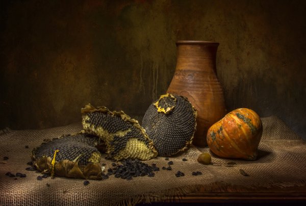 Замысловатый натюрморт, воплощающий в себе прекрасное сочетание осени и летнего солнца. Главными героями этой живописной композиции стали яркая тыква и величественные подсолнухи. Ярко-оранжевый оттенок тыквы создает ощущение тепла и уюта, а лучи солнца, отраженные на золотистых цветках подсолнухов, наполняют картину светом и радостью. Каждая деталь здесь продумана до мелочей - от текстуры поверхности тыквы до игры света на лепестках подсолнухов. Этот натюрморт позволяет окунуться в мир природы, насладиться ее красотой и пережить моменты лета, сохраняя их вечность на холсте.