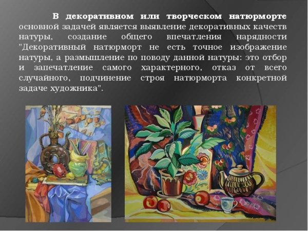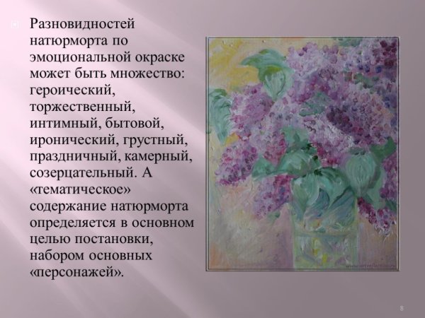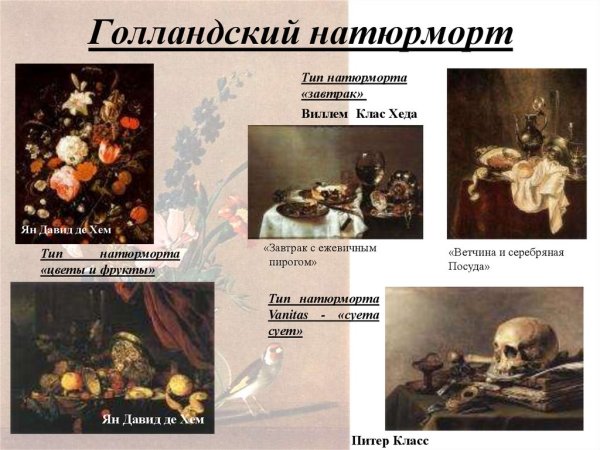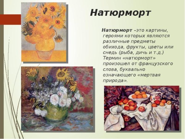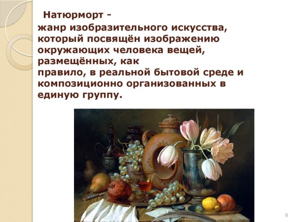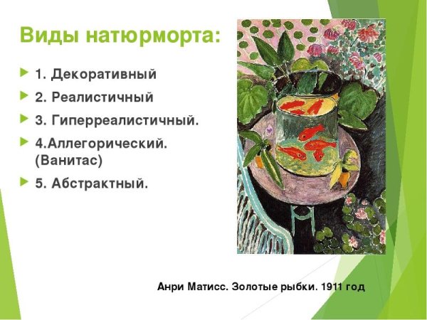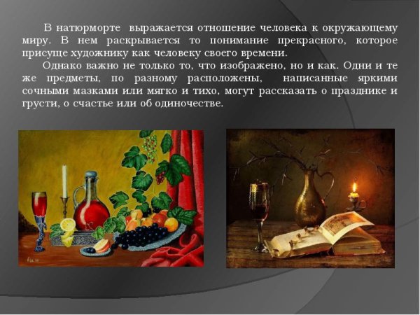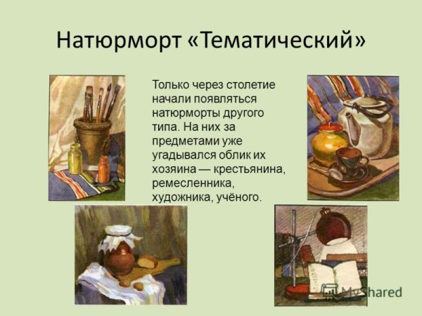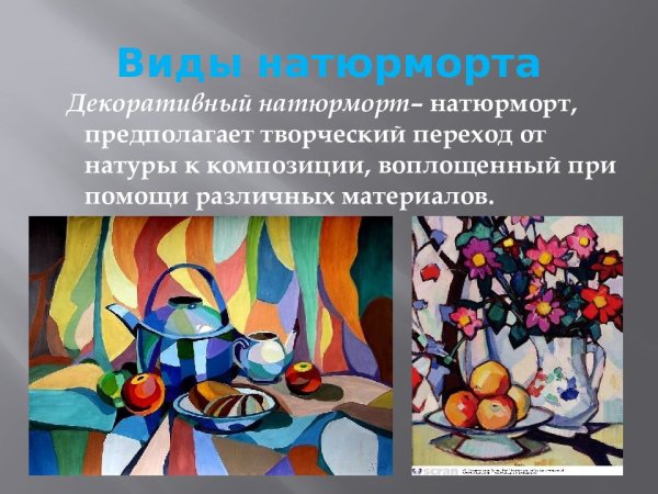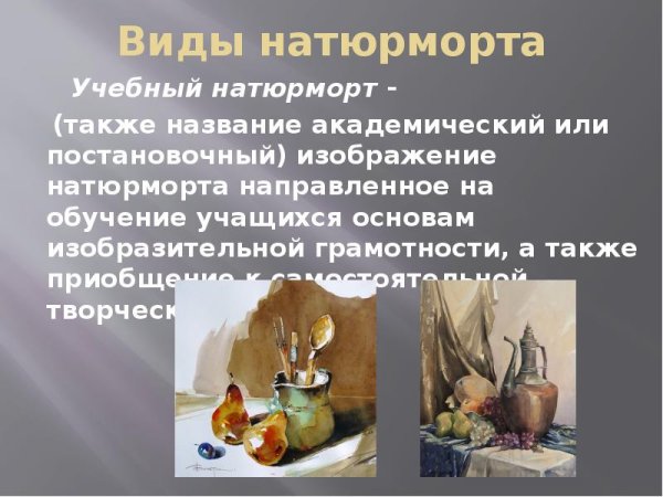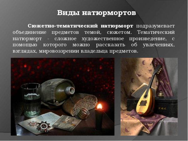 Натюрморт - это жанр изобразительного искусства, в котором художники изображают неживые предметы, такие как фрукты, цветы, посуду или другие объекты. Существует несколько подвидов натюрморта, каждый со своими особенностями. Классический натюрморт отличается строгим композиционным устройством и активным использованием светотени. Он часто показывает различные предметы на заднем фоне, создавая ощущение пространства и глубины. В то же время, современный натюрморт может быть более экспериментальным и абстрактным, играя с формами, цветами и текстурами объектов. Независимо от подвида, натюрморт позволяет художникам выразить свою индивидуальность и креативность, создавая прекрасные и захватывающие произведения искусства.